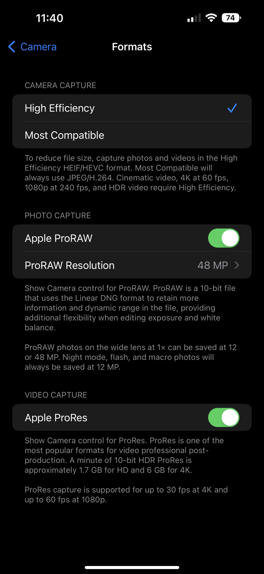 Maybe you can clear something up for me.. the 2 choices high efficiency or most compatible,In way there is a quick way to turn ProRAW on and off by touching it on the screen. Just turn the ProRAW on in camera under the settings menu and save it on preserve settings.