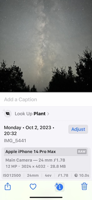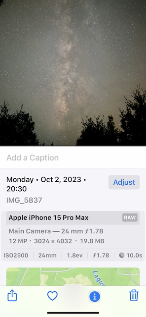 I took the images on a tripod in 30 sec. night mode, with the 24mm cameras, in ProRAW, and converted to jpg using the Preview app on the Mac, no adjusting of brightness, contrast, etc. Here are the info screens for the images: