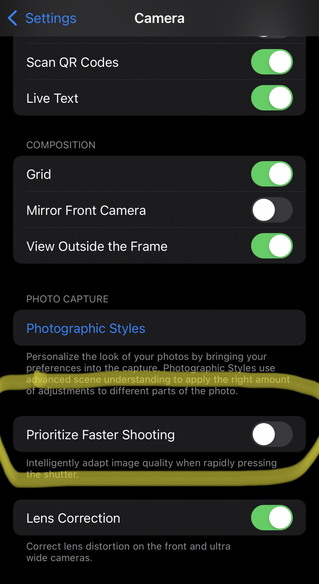 It's currently set to "Off" although I've tested it in both settings with the same results. I've pretty much tested every possible combination of settings over the weekend. I'm thinking now that this is simply a case of Apple post-processing this image for what they think 90% of users would like. My concern with it, as a photographer, is that the software should not be applying irreversible touch-ups to a photo automatically...just give me what's in the viewfinder!