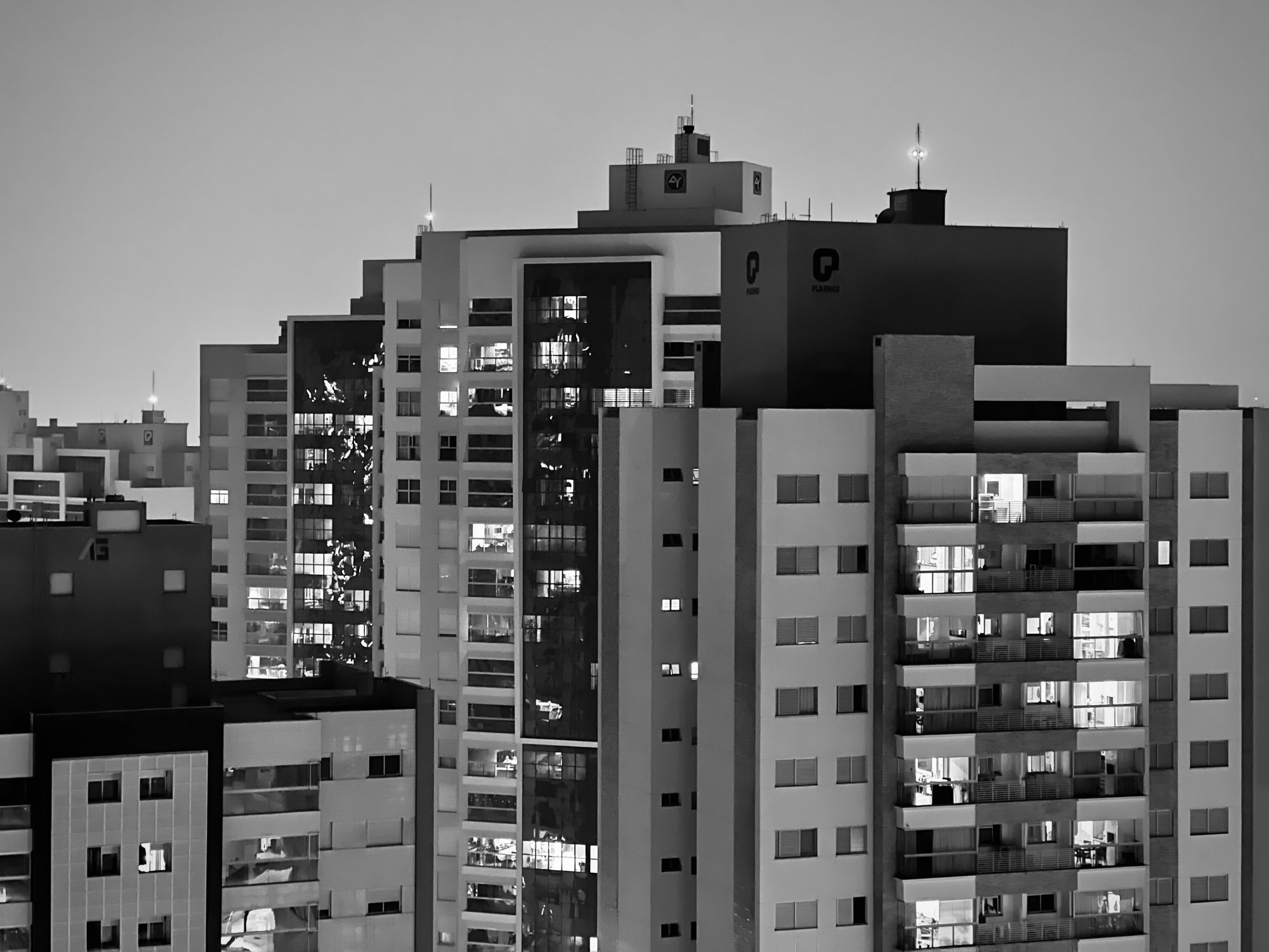 second look: the atmosphere is awesome, low light, lights on in the flats, the sharpness and b/w gives it a special atmosphere. Great