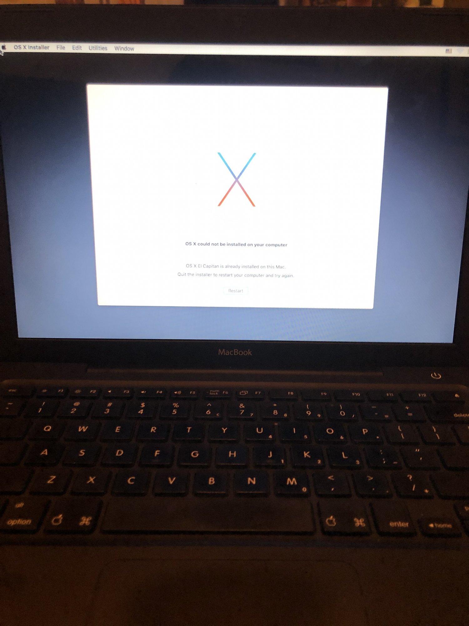 So, I got a black MacBook 2,1 , It’s a nice laptop, nicer with 4 gigs of ram. Lion was disappointing, so I downloaded Pikify and put El Capitan on it, but that’s when this happened: El Capitan could not be installed: El Capitan is already installed. I tried rebooting and the same thing happened. Even more curious, it’s frozen, trackpad, keyboard, external mouse don’t work. Specs 2ghz core 2 duo, 4gb ram. MacBook 2,1 late 2006. screenshot below. Any help appreciated.