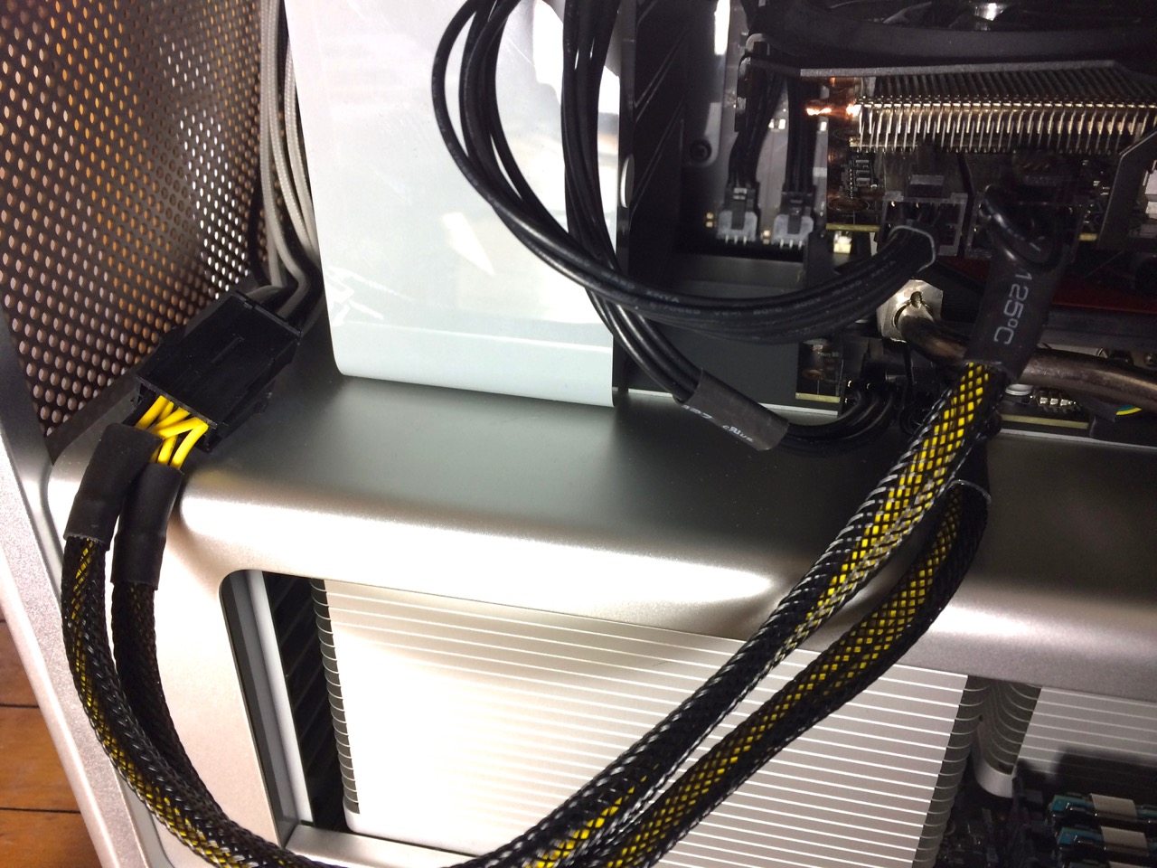 And here's what it looks like with the cable folded up, and the Amfeltec card resting on the inner lip of the drive bays (I put insulating tape behind there):