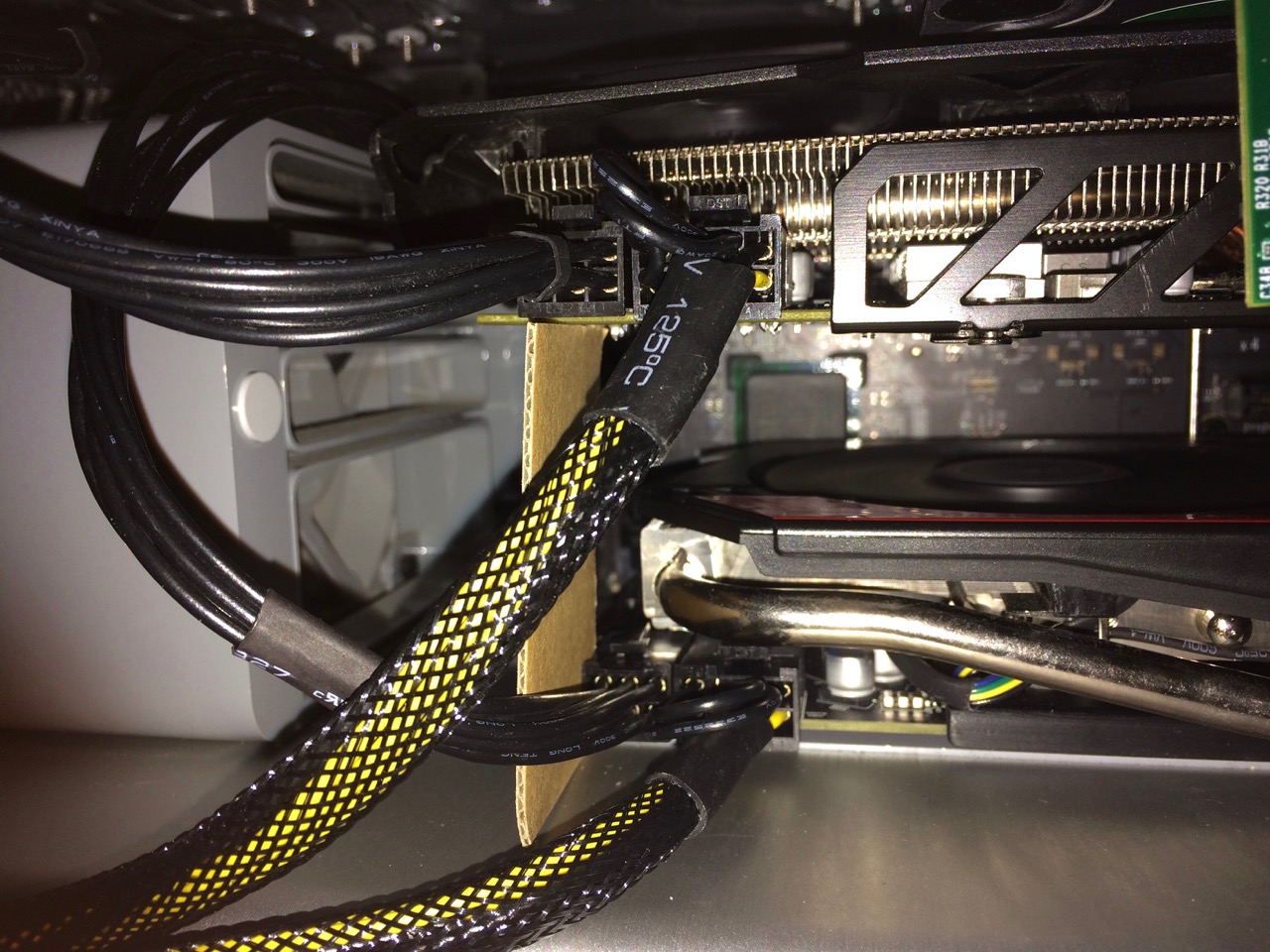 Here's the lower compartment, showing how the extension cable plugs into the 2-to-1 splitter, which then plugs into each of the R9 280X cards (each card also gets a 6-pin connection to the Mac Pro's backplane board):