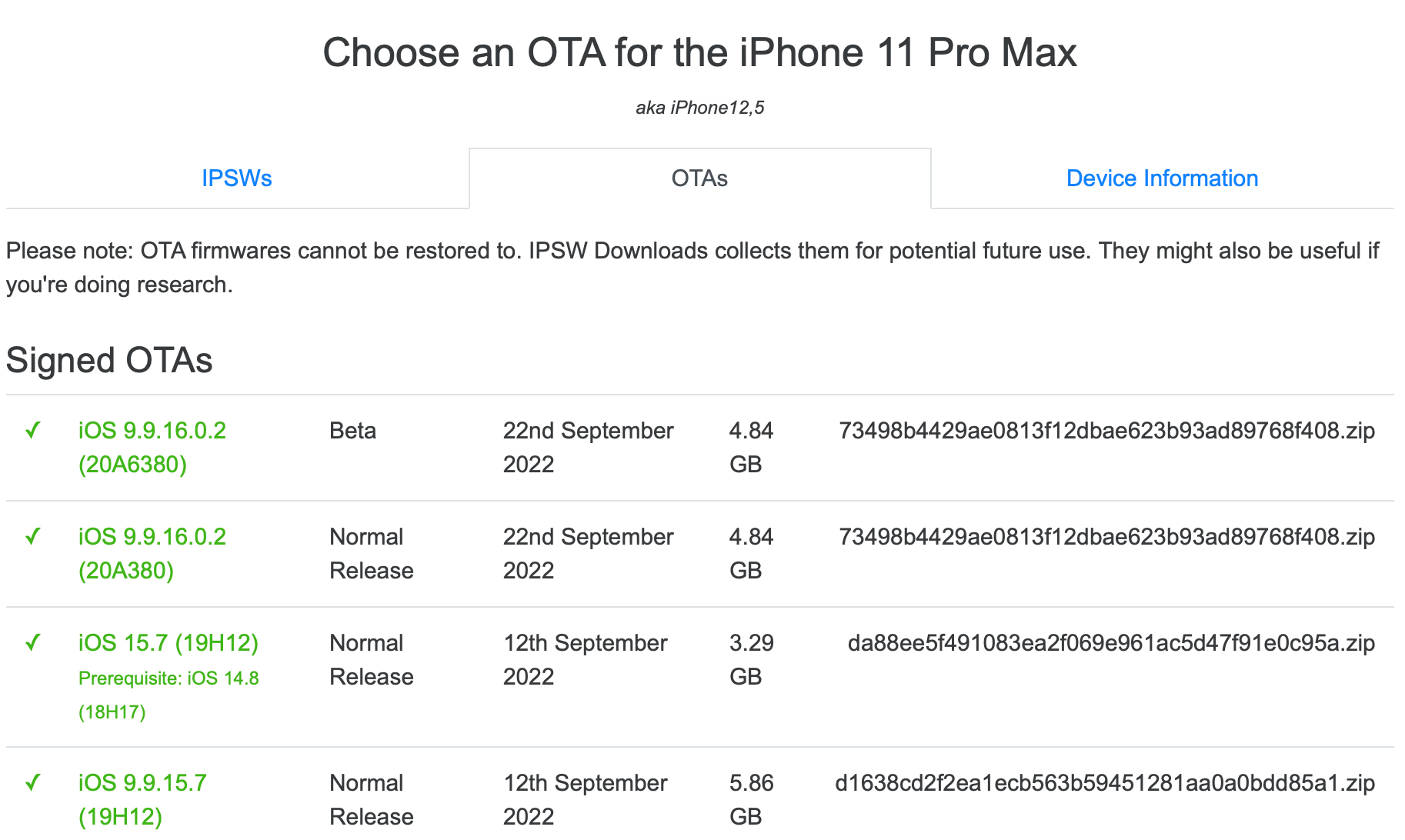I need an Offical IOS 15.7 IPSW file from apple server not OTA because i dont find it on the ipsw site , and i need to downgrade my iphone , my device is iphone 11 pro max.