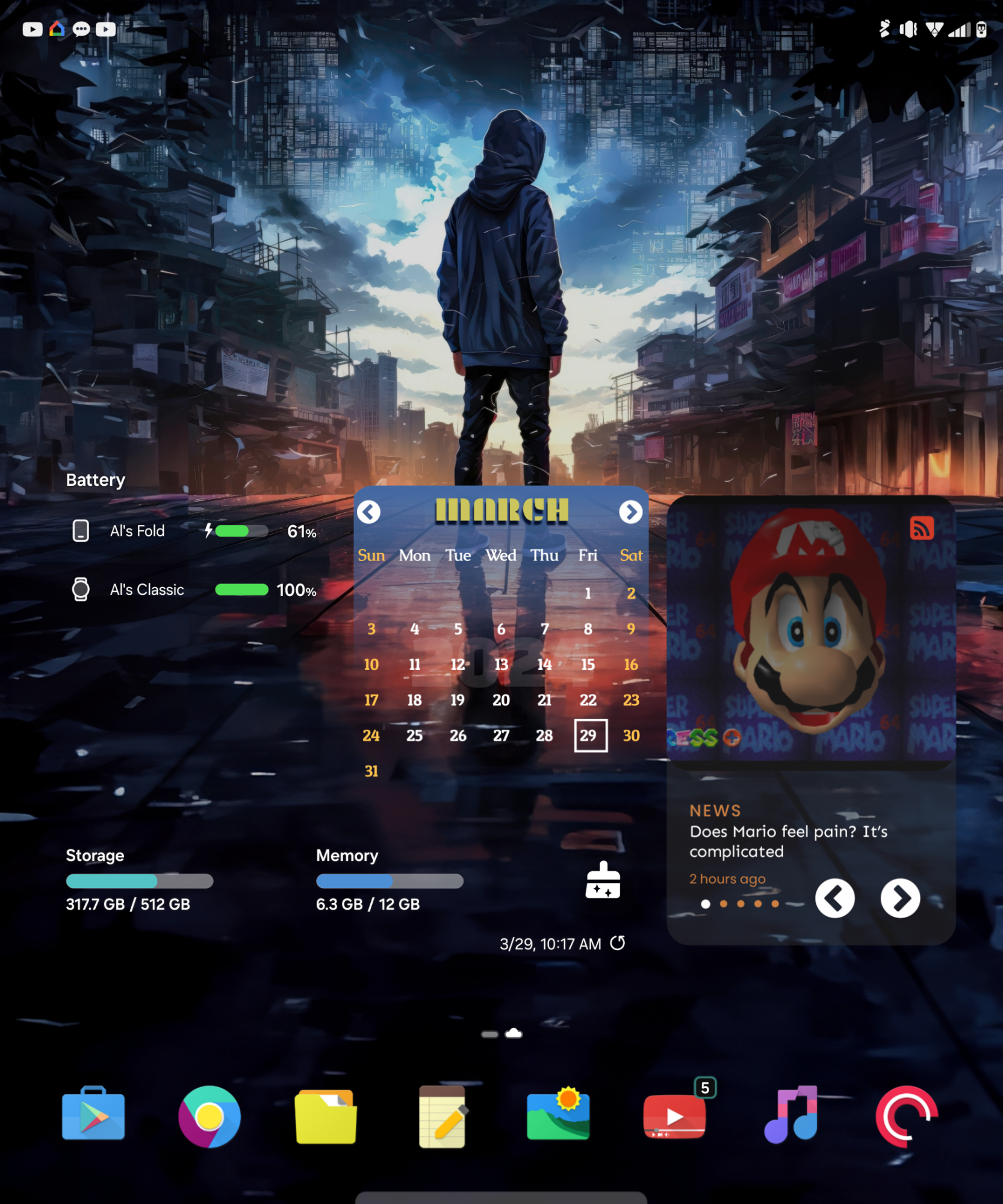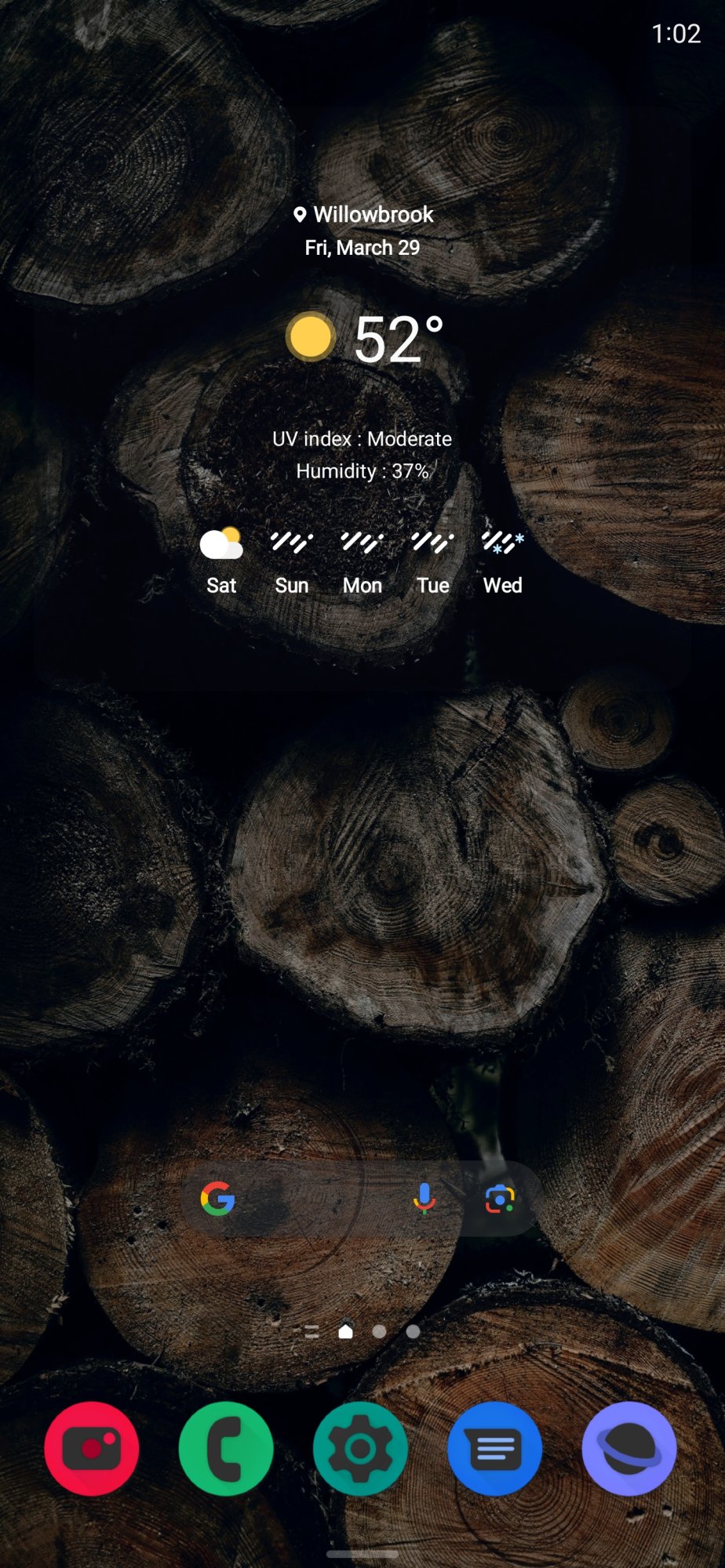 Have some widgets for pictures, Google Keep, weather app and a 4 app folders on the second screen, the third screen is just my calendar as a full page.