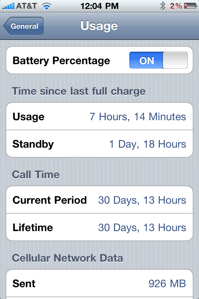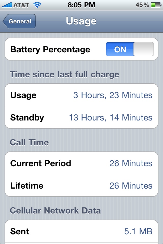 Couldn't be happier. Charged all the way up over the weekend and then let it die (to condition the battery - if that is even still recommended). Results below. Way better than anything my 3GS could do. I have the exact same settings as when I had the 3GS. Brightness around 30%-40%, Fetch 15min, Location off except when needed. Pretty normal use of email, phone, web surfing, 3G and WiFi, a little GPS, etc. Fully charged it up again this morn and I'm at 1hr 6min and 4hr 35min with 86% left. Will be interested to see if I get similar results as over the weekend.