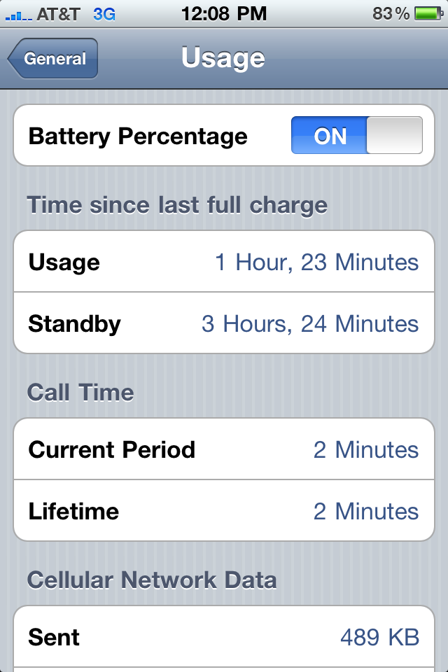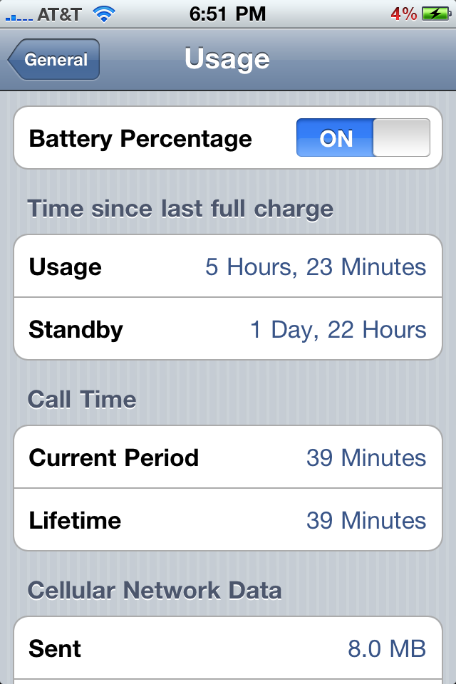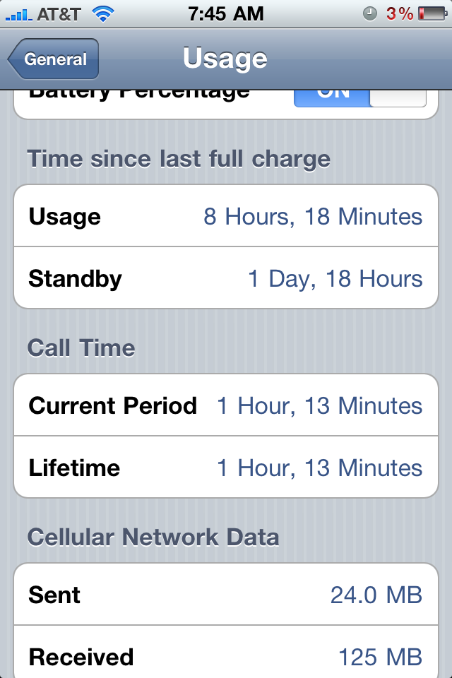 So, that being said, today I used the phone heavily, lots of web surfing via both wifi and 3G, lots of speedtest tests on 3g, which must be tough on the battery, about 30 min 3G calls, some email and sending large pics, but, no ipod, and I hit the 50% mark at exactly 3.5 hours of pretty hard usage. It'll be interesting to see how accurate the battery indicator is, and if that number doubles or not, I did run it to zero last night, then fully charged, so it should be accurate.