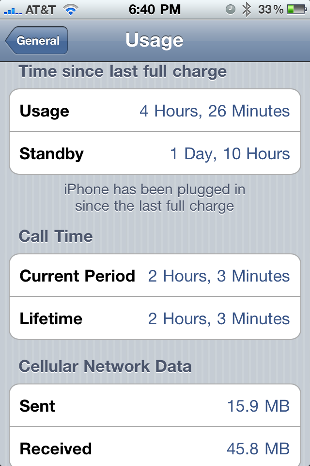 I have hardly used the phone today (4 minutes of calls), and for data it has been email, twitter and maybe a little web browsing, all over wifi.