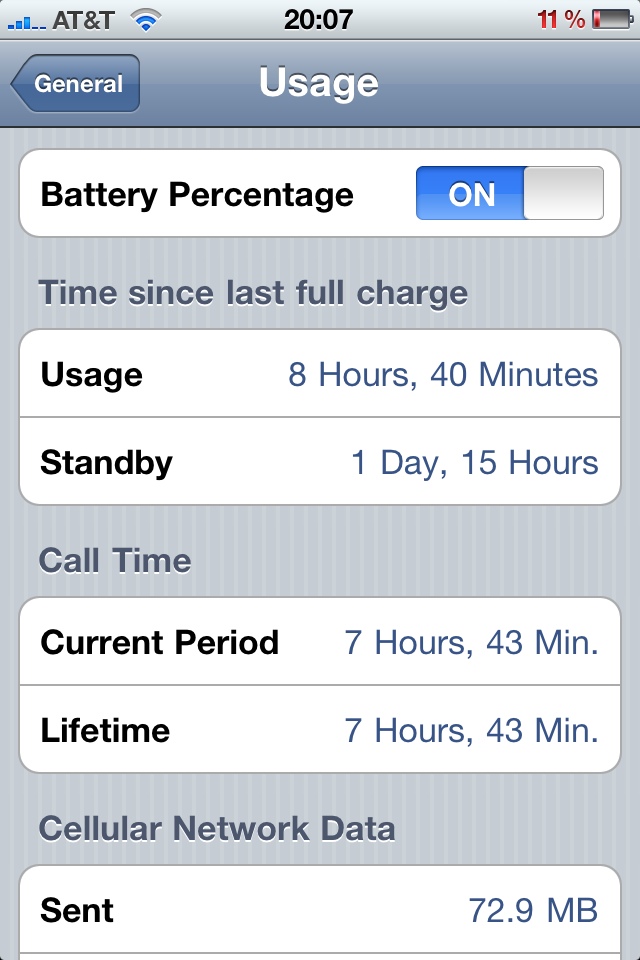 i'm now at 7 hours 1 minute of use with 1 day and 3 hours of standby with 30% battery remaining