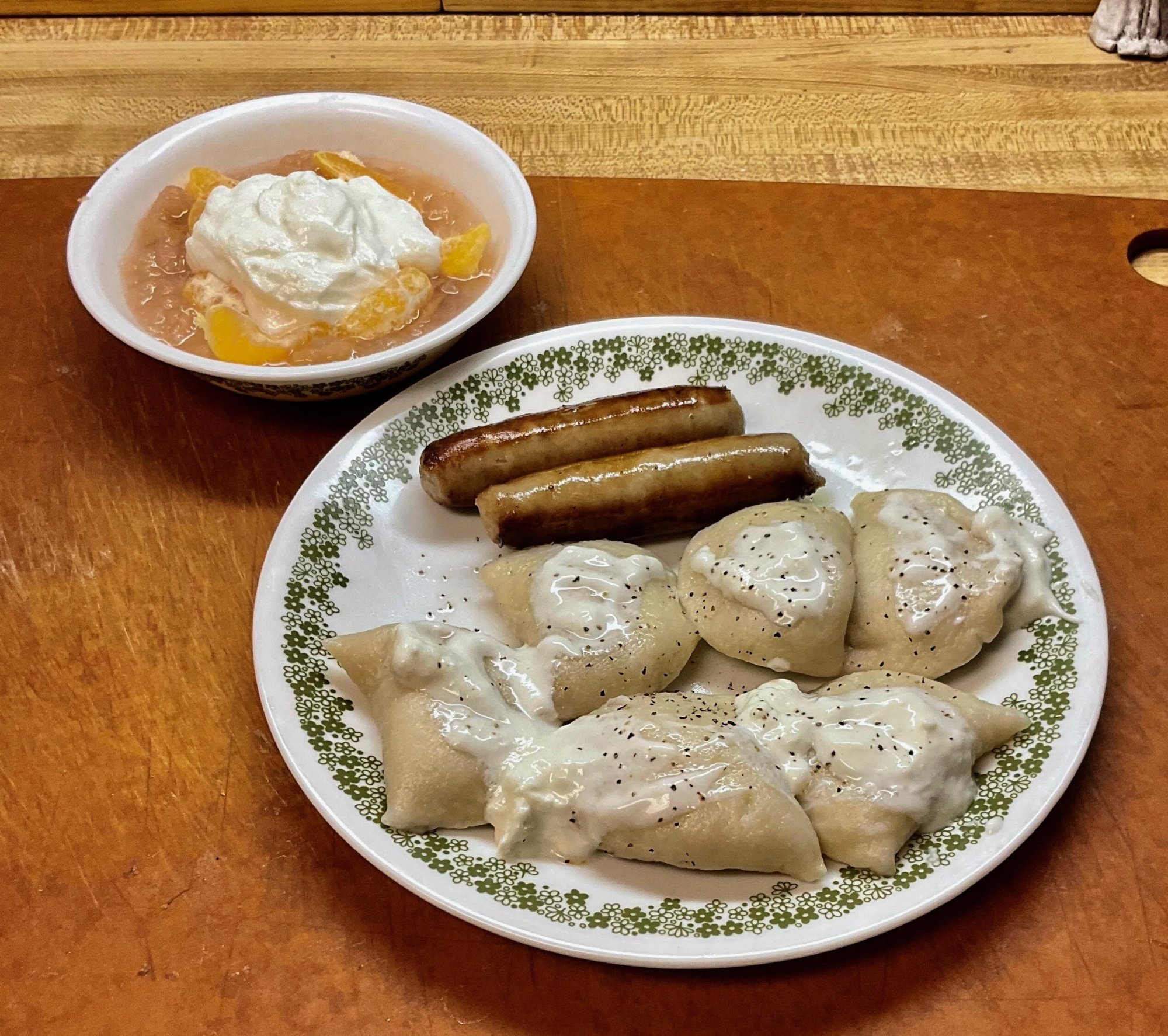 Nothing short of perfect!.. an on-my-own dinner yesterday ... breakfast sausages, w/potato & white cheddar cheese perogies (from a local Costco), and my homemade apple sauce w/Mandarin orange, and each topped w/some natural yogurt.