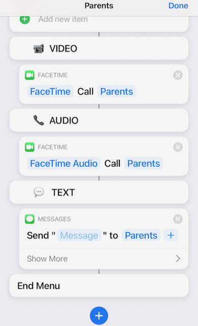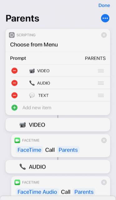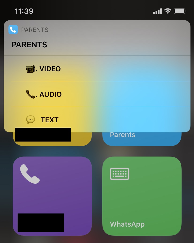 I keep changing my mind, especially regarding stacks. However, here's mine at the moment. In an attempt to replicate the missing Favourites widget I've created 2x2 widgets on my Today View screen. Originally, I had video, audio & text stacked, but while playing I kept calling people by accident! So I removed the stacks and instead added a menu to the shortcut. That's what the last screenshot shows (after I click "Parents").
