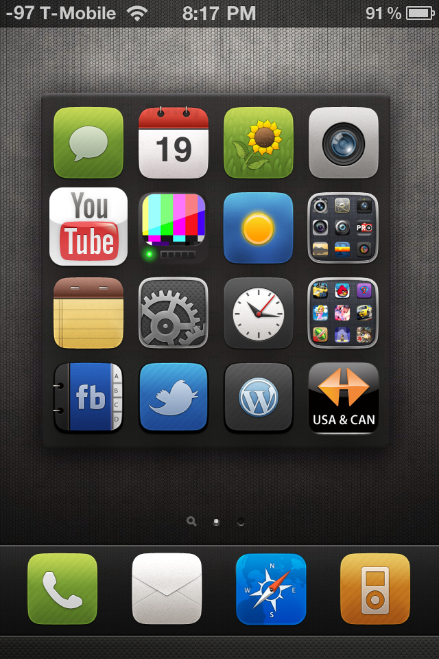 And when opening folders, the wallpaper from Suave disappears and all you see in the background is black, then when you close the folder, the Suave wallpaper returns. That was distracting & ugly as well.Sad. I have the perfect lockscreen with the perfect icon set up, but no iPhone 4 compatible theme to use for the icons. *grumble*