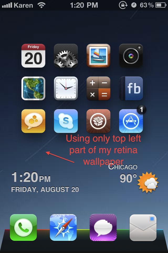 The problem I have is that the included wallpaper is 320x480 pixels, and all the code in the included html files are also for 320x480 pixels. It doesn't look very well for retina displays. I was able to put in my own 640x960 wallpaper, but of course it only uses and sees the first 320x480 pixels (the top left quarter) of my highres wallpaper. I've tried playing around with the code and changing all the pixel sizes, but I ended up breaking something, and the weather wouldn't show up at all.