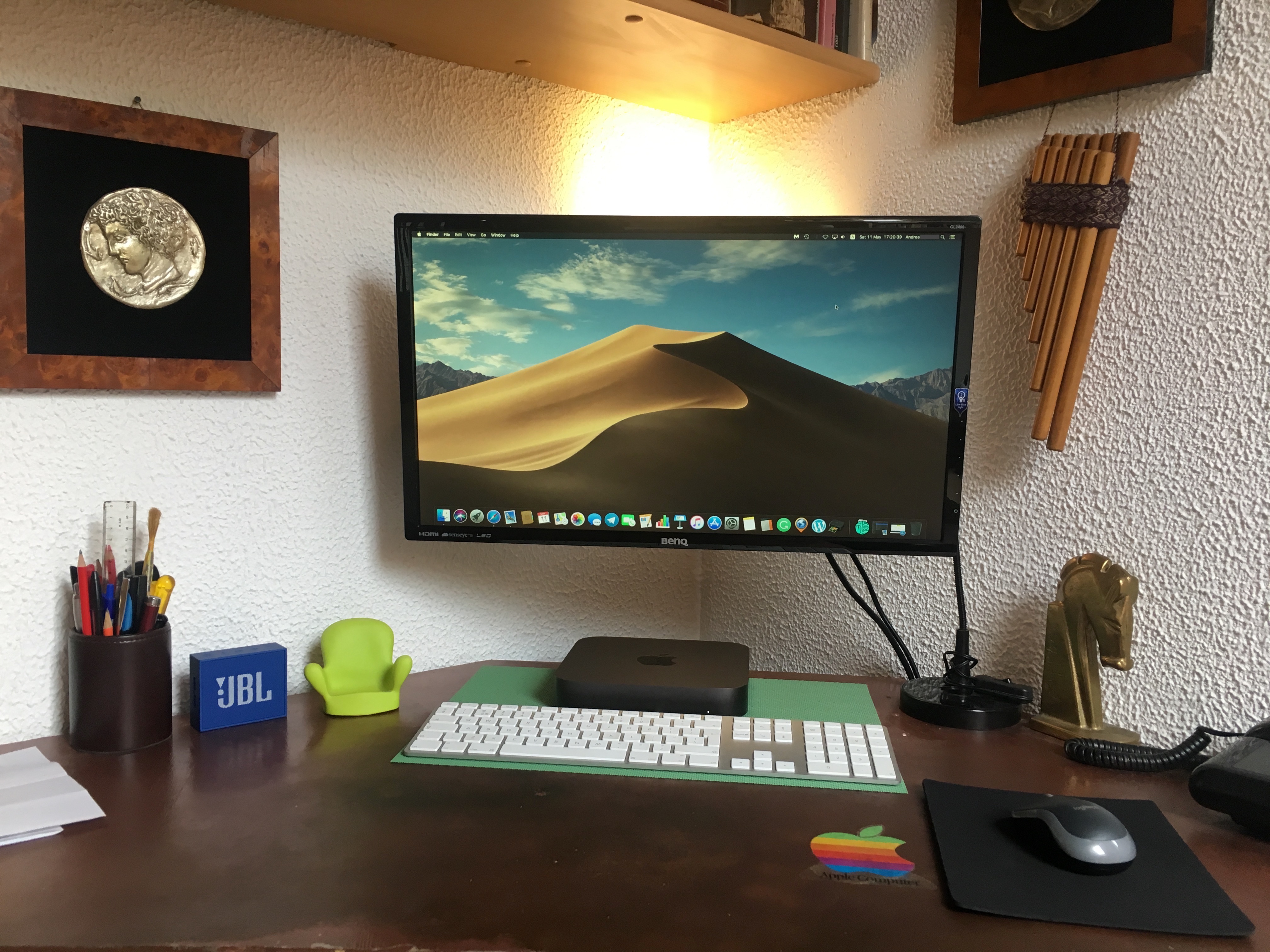 LG 34wk95u and one of my old acer 24' monitors mounted on the wall. The LG monitor is perfect for the new mac mini. Connected via usb c directly to the mac and via display port with my Sonnet Breakaway Box 550 under the desk. I only turn it on with a smart home plug to do CAD and some gaming. Otherwise it is too noisy even under the desk.