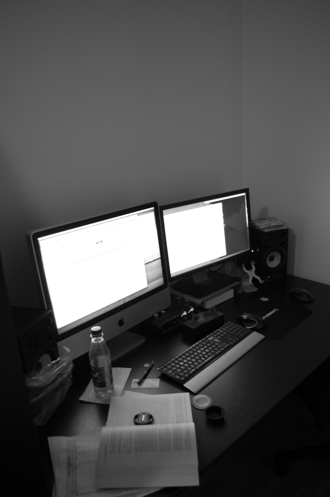 The desk. (iMac & Dell U2711 connected to the Lian Li X2000F.)