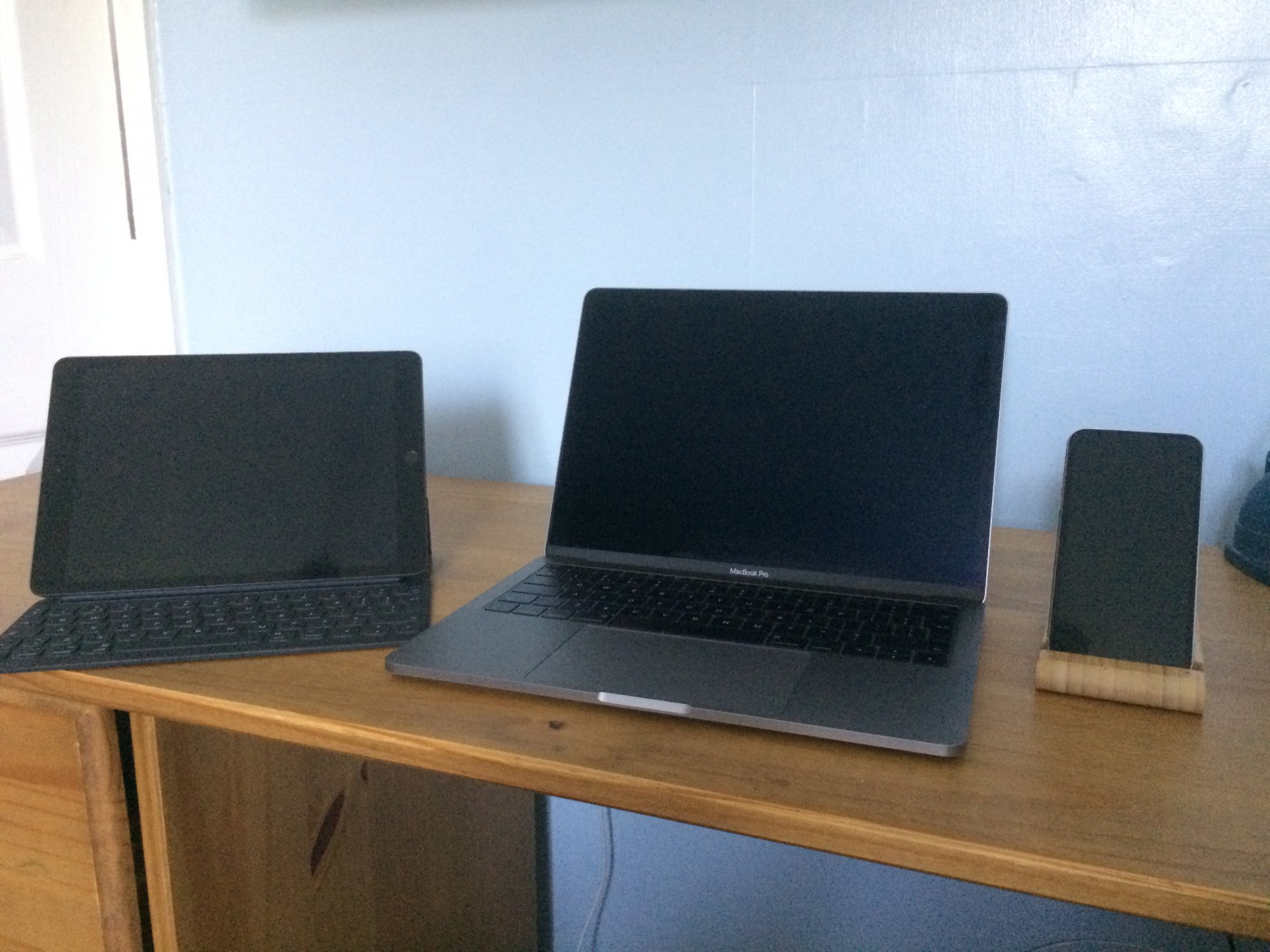 My MacBook connects to everything using a USB-C dock with integrated power (hidden behind the iPad), so it's one cable and I'm charging, connected to my monitor, and also backing up to time machine.