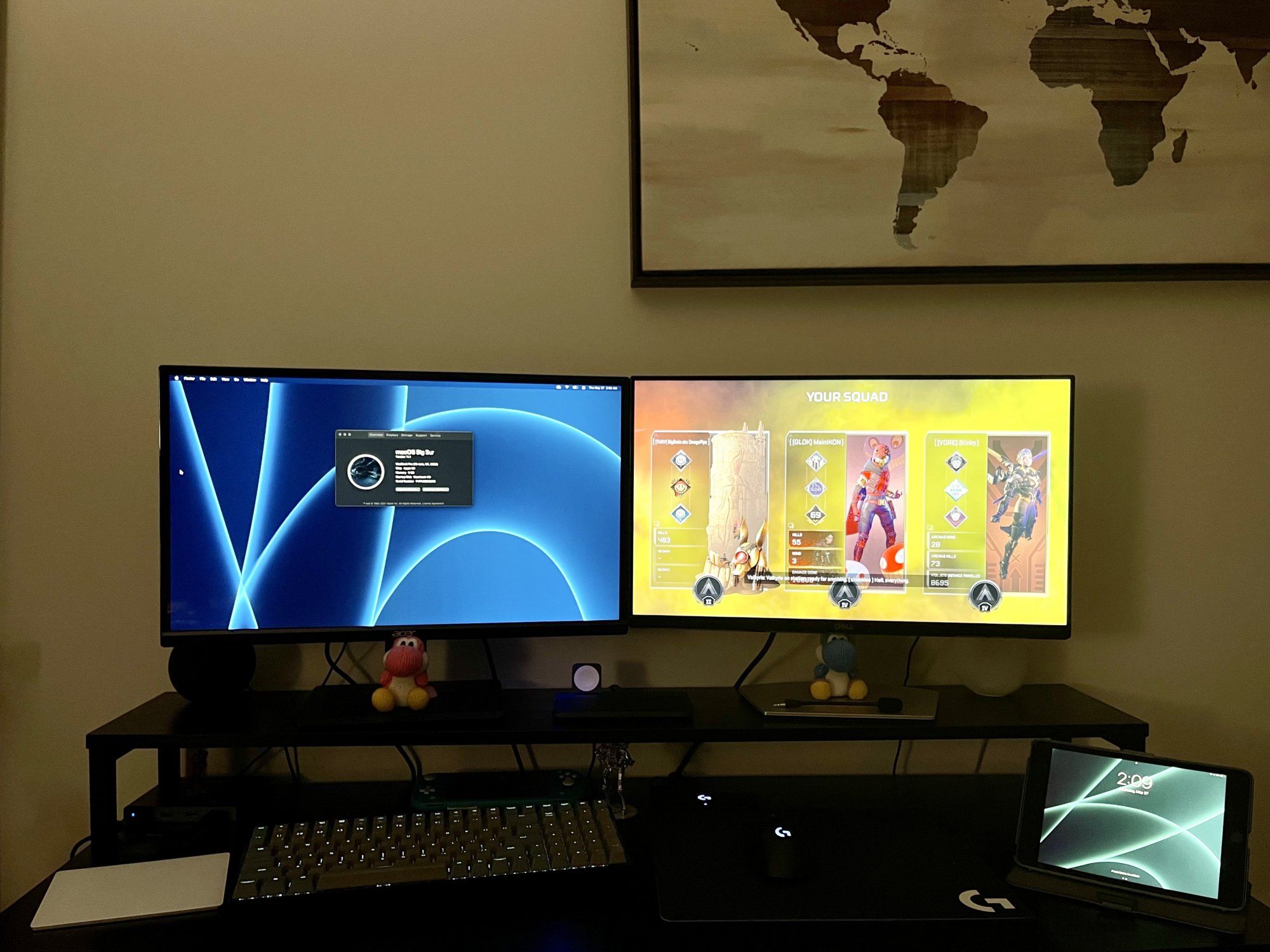 Quick nighttime shot of the setup. My Mac is an M1 13" Pro underneath the table, connected to the left monitor. The right monitor is showing my gaming desktop. I use the Magic Trackpad with my Mac and the Logitech G703 (I think) for my mouse with the Windows computer, and I swap my keyboard with bluetooth.