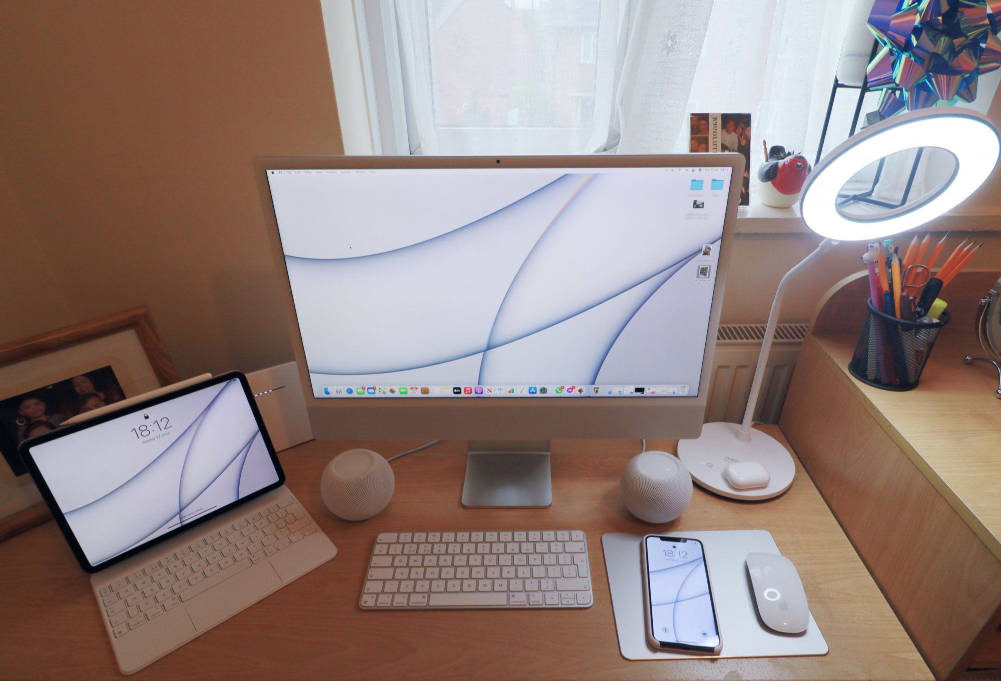 Also pictured is my iPad mini and my Logitech Pro headset (for gaming). The Nomad Base Station Pro (for wireless charging on the desk), and two HomePod minis! I need to trade the white for a black (they were originally in different rooms).