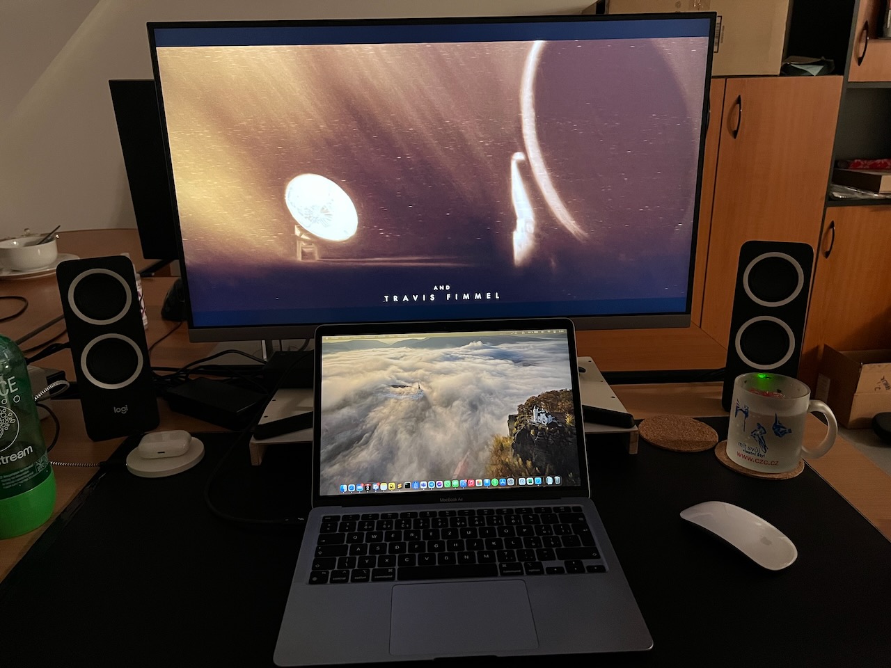 System is: base M1 Macbook Air 8GB, on a new Twelve South BookArc stand (hidden behind the Lando Calrissian action figure), connected to a 27" LG 27UL50 4K display via HDMI via Apple's USB-C Digital AV Multiport Adaptor.