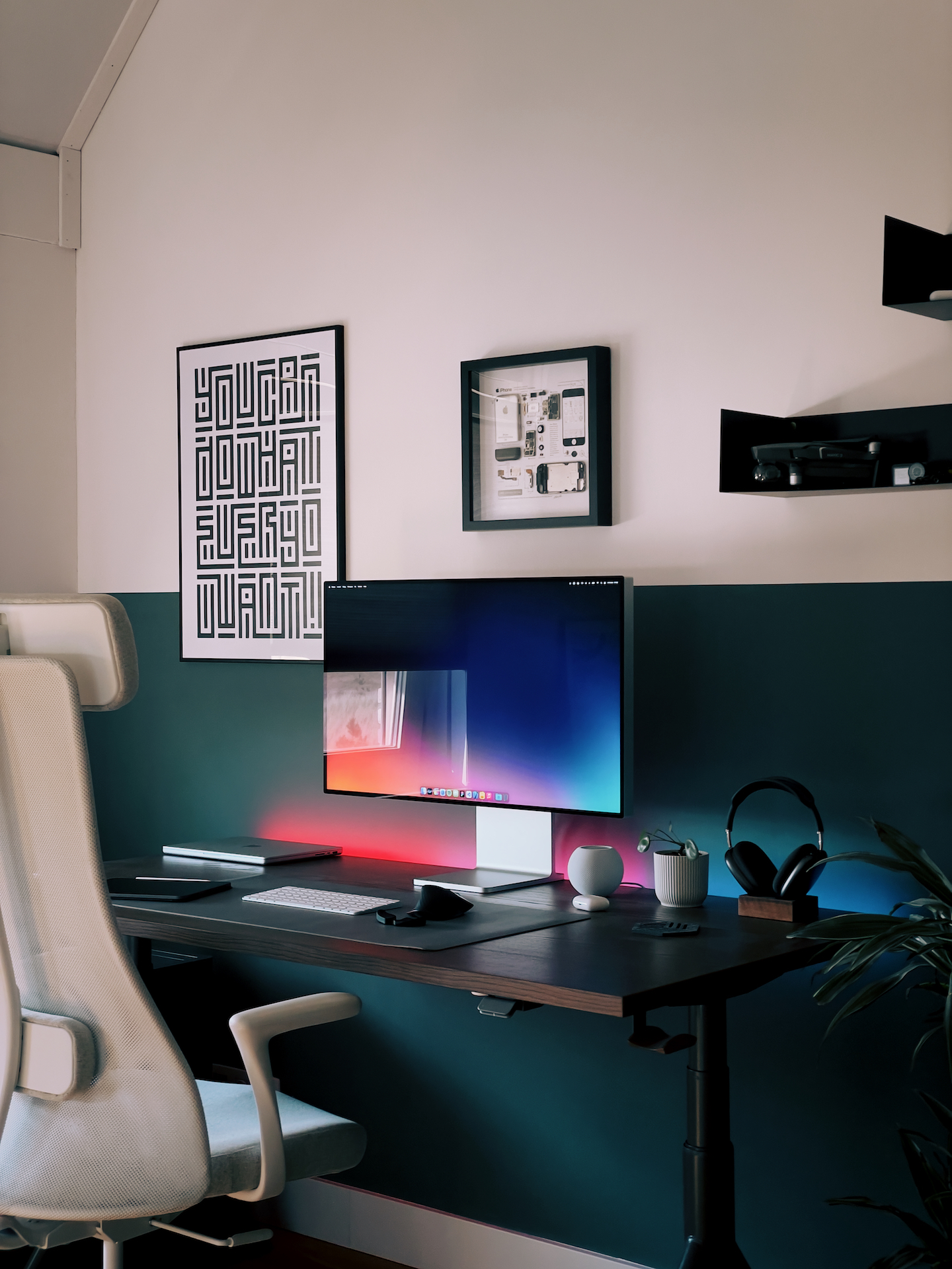 Nope, just a Philips Hue Gradient Lightstrip that syncs the desktop. The wallpaper is part of this collection.Did you actually mimic the wallpaper with wall washers? Way cool 😎
