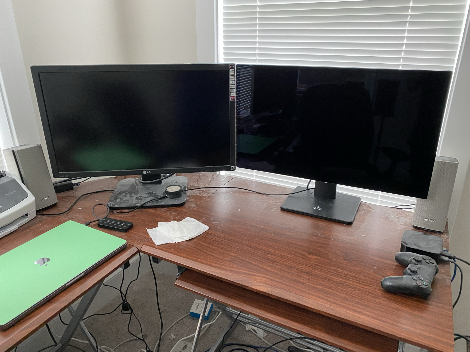 Finally replaced my HP N223 with a Cinema Display I had lying around (got a DVI-HDMI adapter). Not as bright as my MacBook display, but fine though. And, if you're wondering, the mic does NOT block the Cinema Display, even though it kind of looks like it does in the photos. Cable management is still garbage.