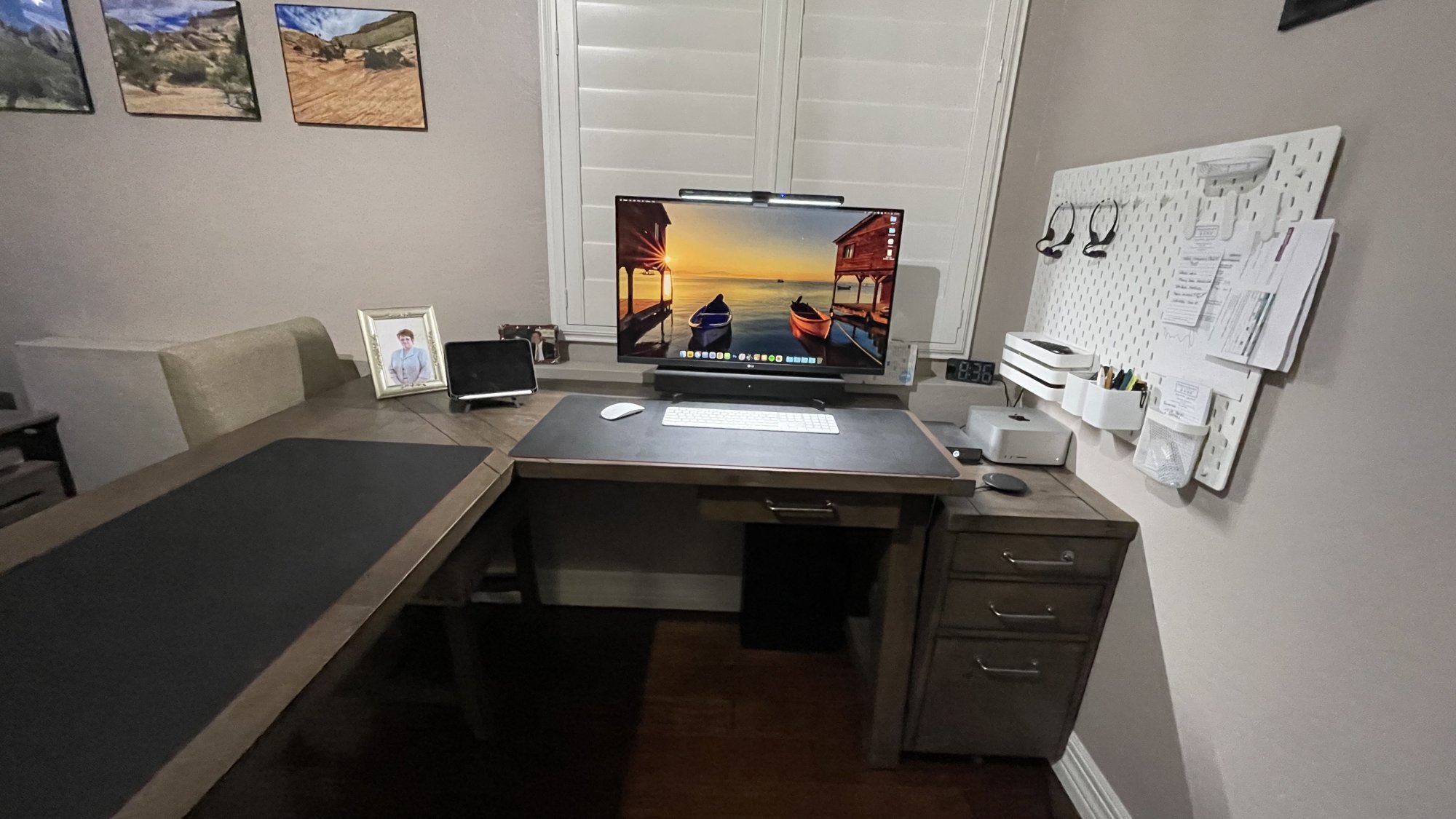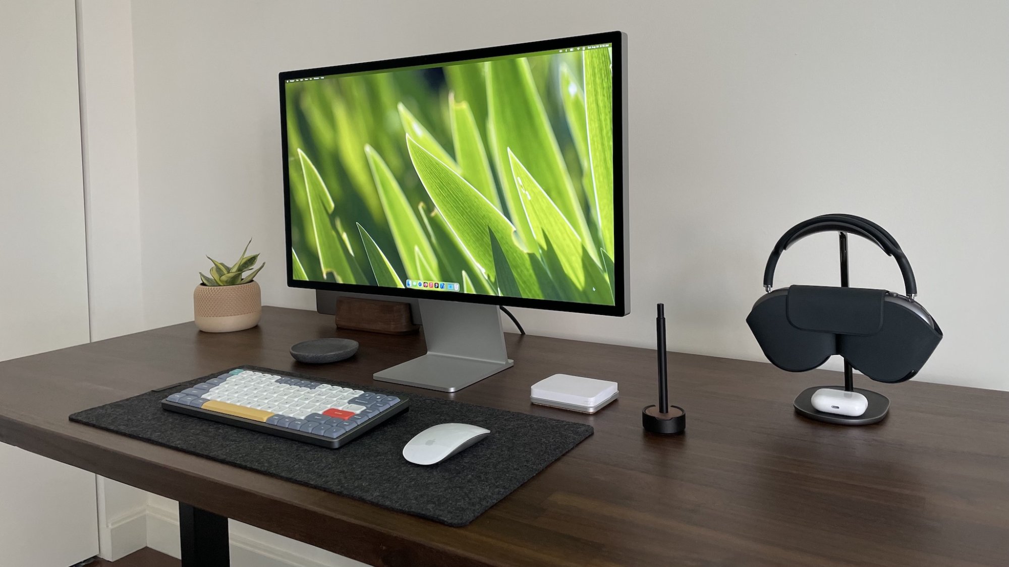 Here's my setup in my new apartment! I'm currently running an M1 Max 16" MacBook Pro with a 20" Apple Cinema Display, which is still a phenomenal display nearly 20 years on.