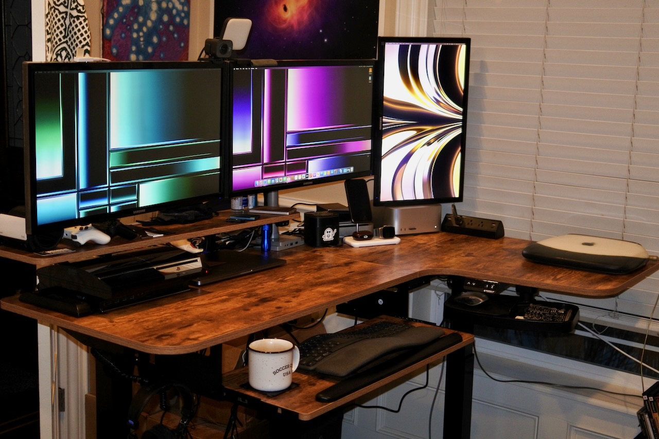 Desk is a Eureka Ergonomics EGD-L60 sit/stand desk in "Rustic brown". Not actual woodgrain, it's composite chipboard covered with a vinyl "wrap". But the surface is a much thicker/better wrap than my old desk which just had a woodgrain sticker that started wearing off quickly. The desk maker expects that you'll just set a monitor on the "raised shelf" on the long direction of the desk - but I like my three monitors, so I got a clamp-on three-monitor arm. The desk has some color-change LEDs on the underside of the "monitor shelf," but I leave those off other than when I'm in a meeting, I turn it on red.