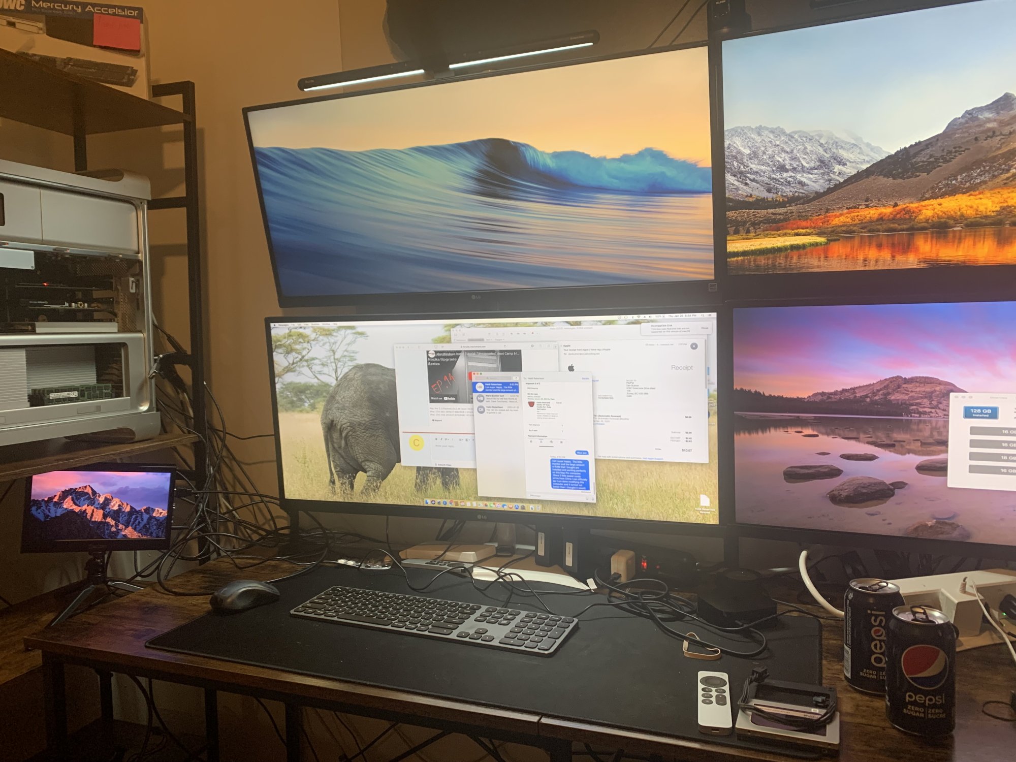 Mac mini M1 - 16 GB RAM, 256 GB SSD. Bought the day of the M1 launch, the only option it got was extra RAM so it wasn't painfully low on RAM. Plugged in are an old Apple SuperDrive (useful for burning CDs to reinstall OSes on my vintage computers,) plus a Seagate 5 GB hard drive and a Western Digital 4 GB hard drive. These were connected to my prior 2012 Mac mini server before it kicked the bucket. This mini has been doing double duty as server + desktop until the Studio arrived. It was also plugged into the far-left display via HDMI, since M1 can only run a single monitor over Thunderbolt/USB-C, if you wanted a second display, it had to be on HDMI. It also meant I could display the mini while another computer was plugged into the dock - which I have moved to be the portrait-mode monitor for the Studio.