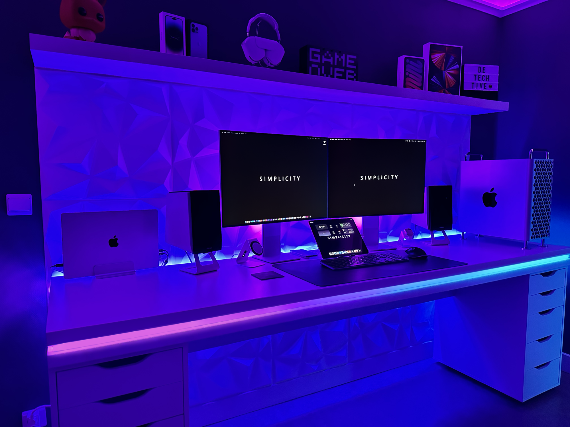 - A Logitech "Litra Glow" lamp (seen perched on top of the center monitor)