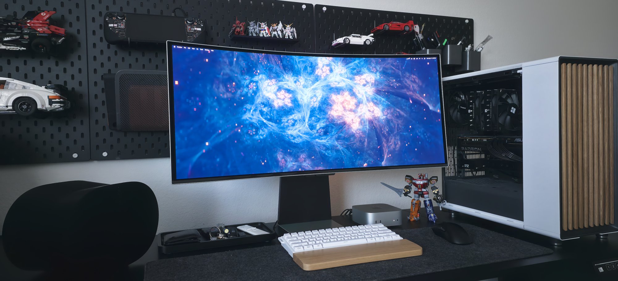 On the right I have my gaming PC (as mentioned, it has a 7080x3d processor and a 9070xt gpu) - it mostly runs Fedora linux and plays all the games I enjoy playing. The 57" is also KVM'd onto my work laptop, a 2018 i9 macbook pro that I will probably use until it stops working LOL.