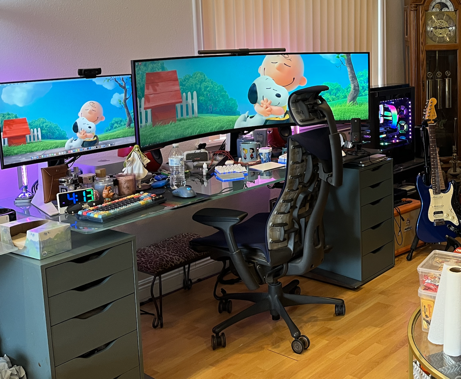 Between my pc and the grandfather clock is a trashcan mac pro, I used to use it on my left side. The lack of MacOS updates and I wanted a more powerful machine for whatever it is I use that for.