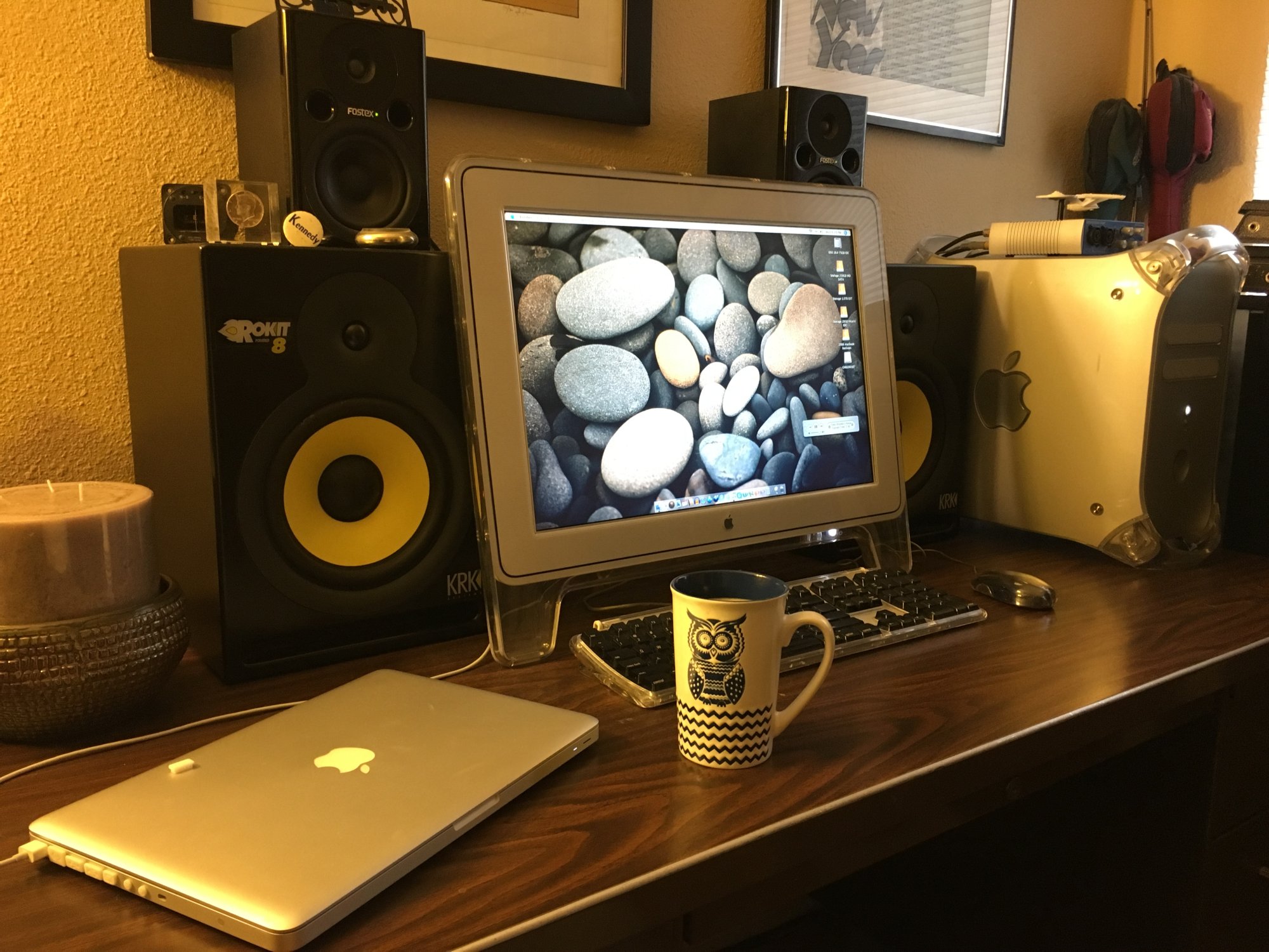 Where'd you get that desk? My old desk completely fell apart (and was just too small anyway), so currently using a plastic table. It works, but definitely not that nice.My current setup: