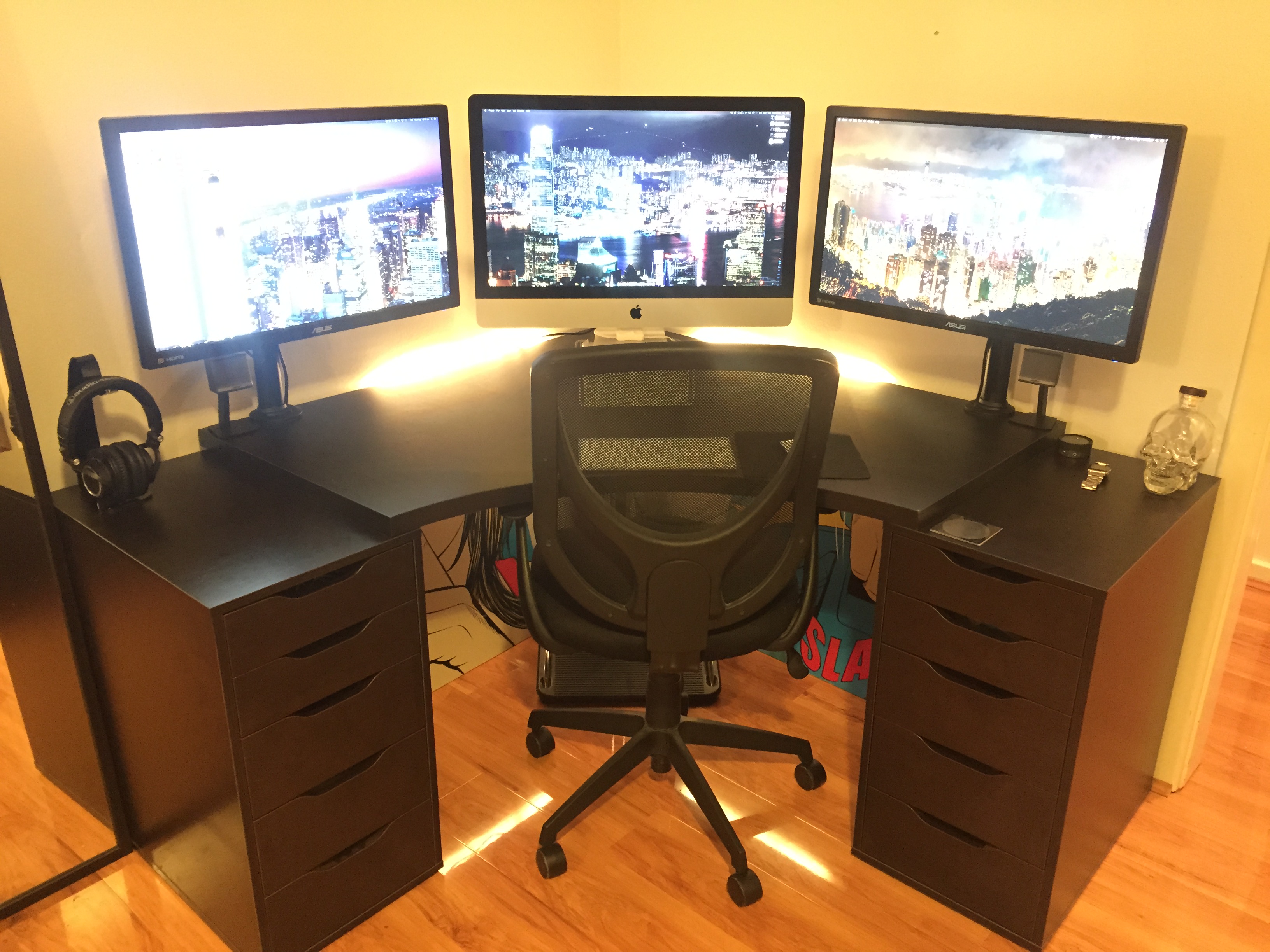 My main workstation, just upgraded the 27" monitors from 1080p to 1440p.. with VESA mounts, so much nicer and really happy with it!