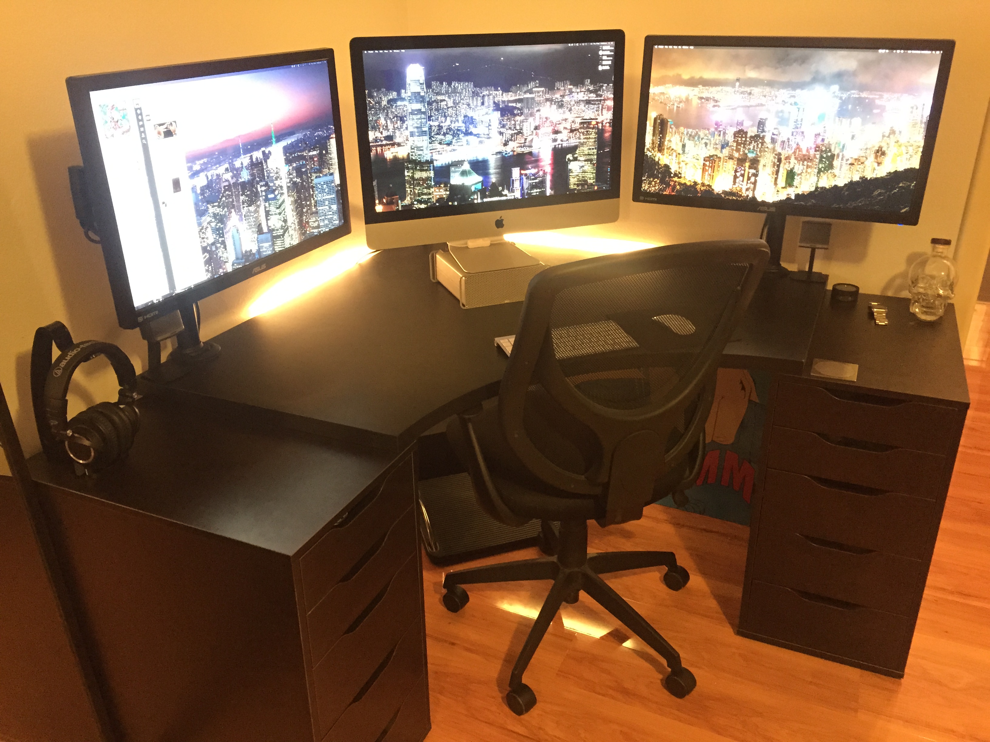 Hello. Nice setup. You gave me a very very good idea with your desk setup. I wonder, could you share with me the desk proportions: h*L*l and how many centimeters are from chair to wall, in the back side of Imac?