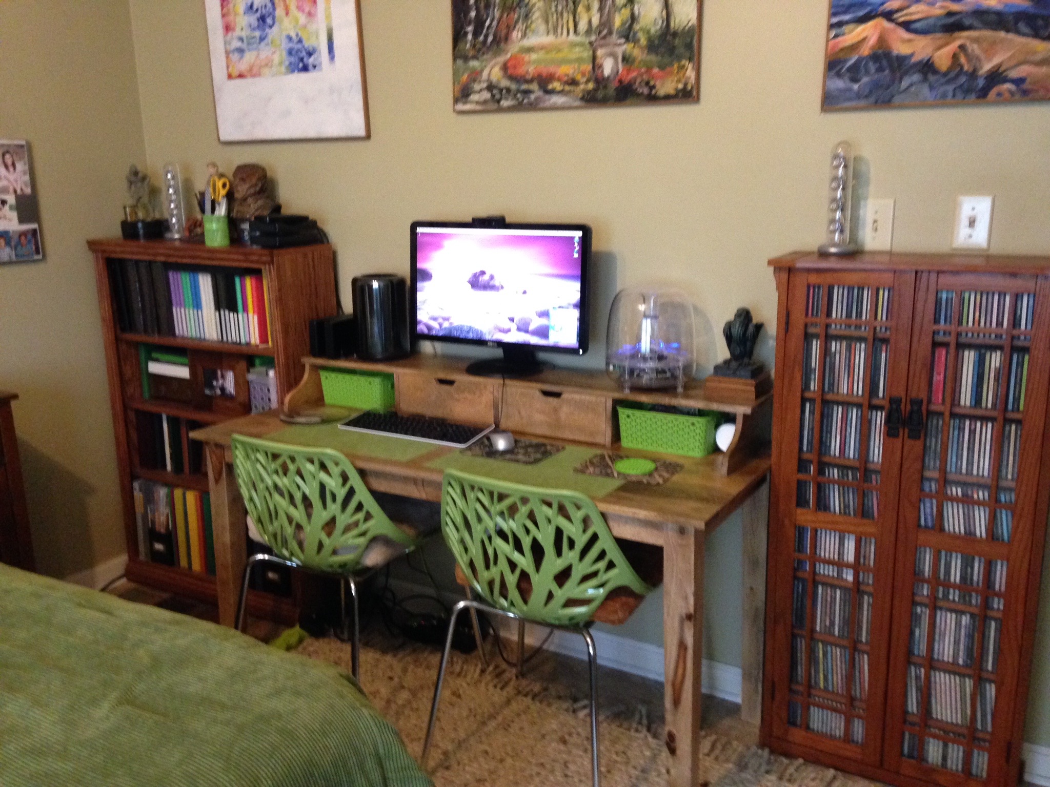 I like your bookshelf. It looks like it has glass windows. very niceDesk from Home Goods. Placemats are because I tend to eat at my desk all the time.