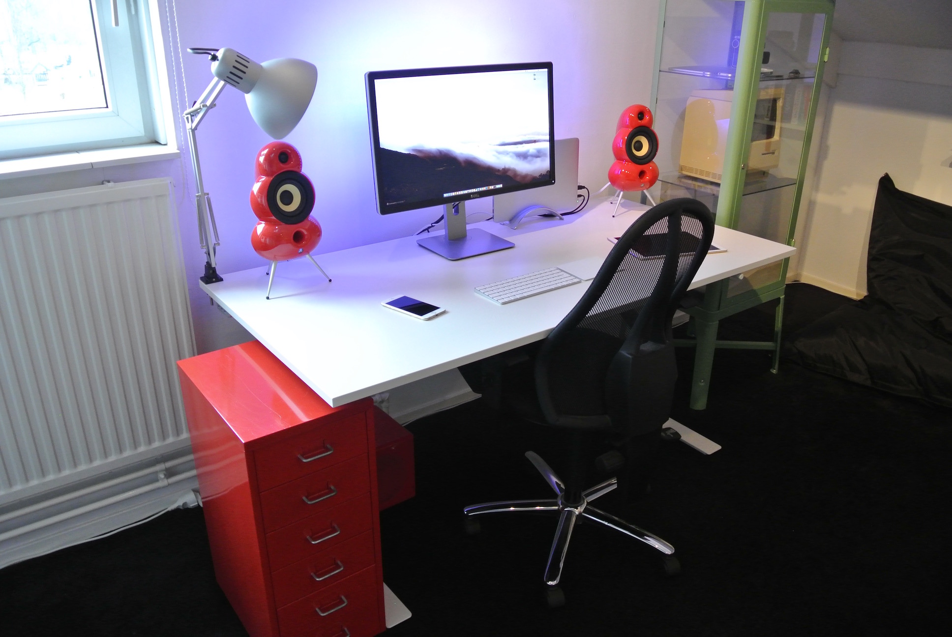 Since then I've gotten a new 5K iMac, so I had to make some modifications to the desk. Removed the large shelf, added two smaller speaker shelves.