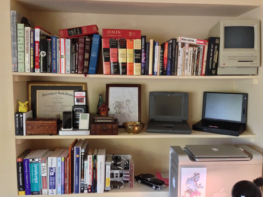 Thanks! That's my old SE on the top shelf, then one down is a PowerBook 540c and a ThinkPad 760XL. Left of those is my collection of originals - my old original iPhone, iPod, and Apple TV. And a small portion of my book collection - you can never have too many!