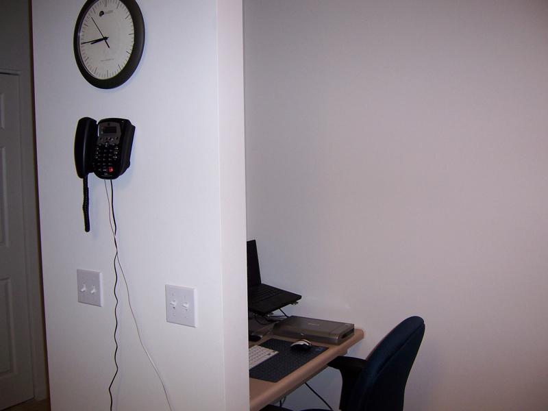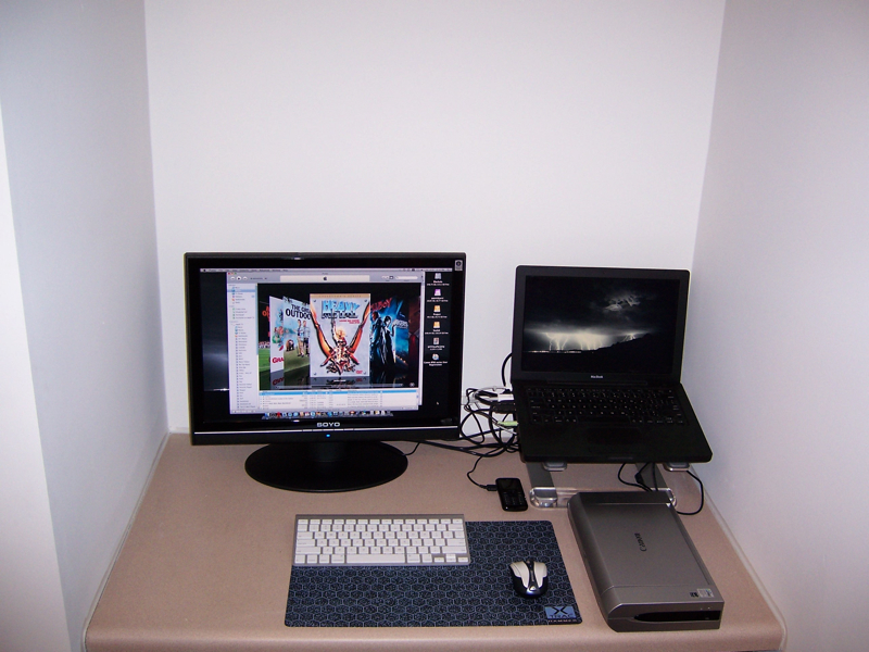 My apartment has a little office nook. The only problem with the current setup is I have to pull the MacBook out whenever I want to put a disc in, and keep the MB pulled out until I remove the disc or else it will eject it into the wall. :eek: