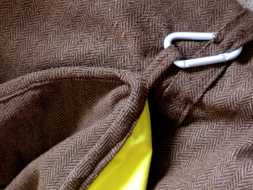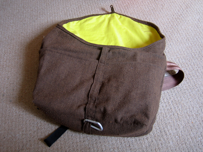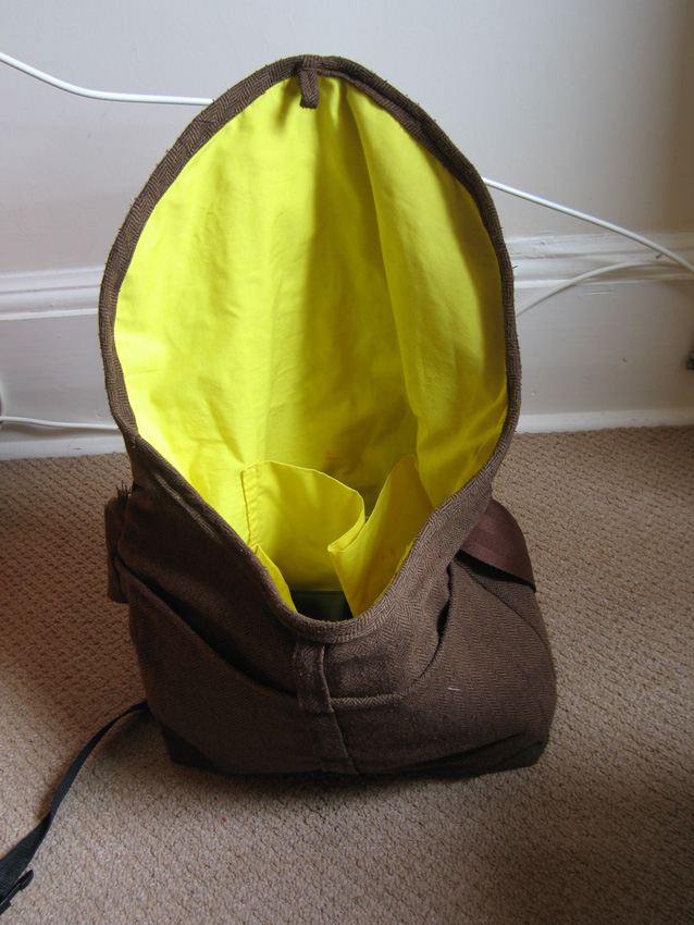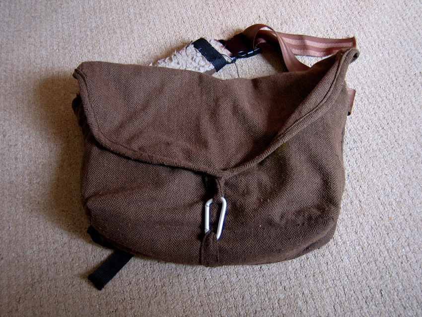 The last thing I made was a messenger bag, and the shoulder strap pad is made from the furry lining from a coat I'd had since I was 15. The outside of the coat fell apart but I kept the fluffy lining for projects like this.