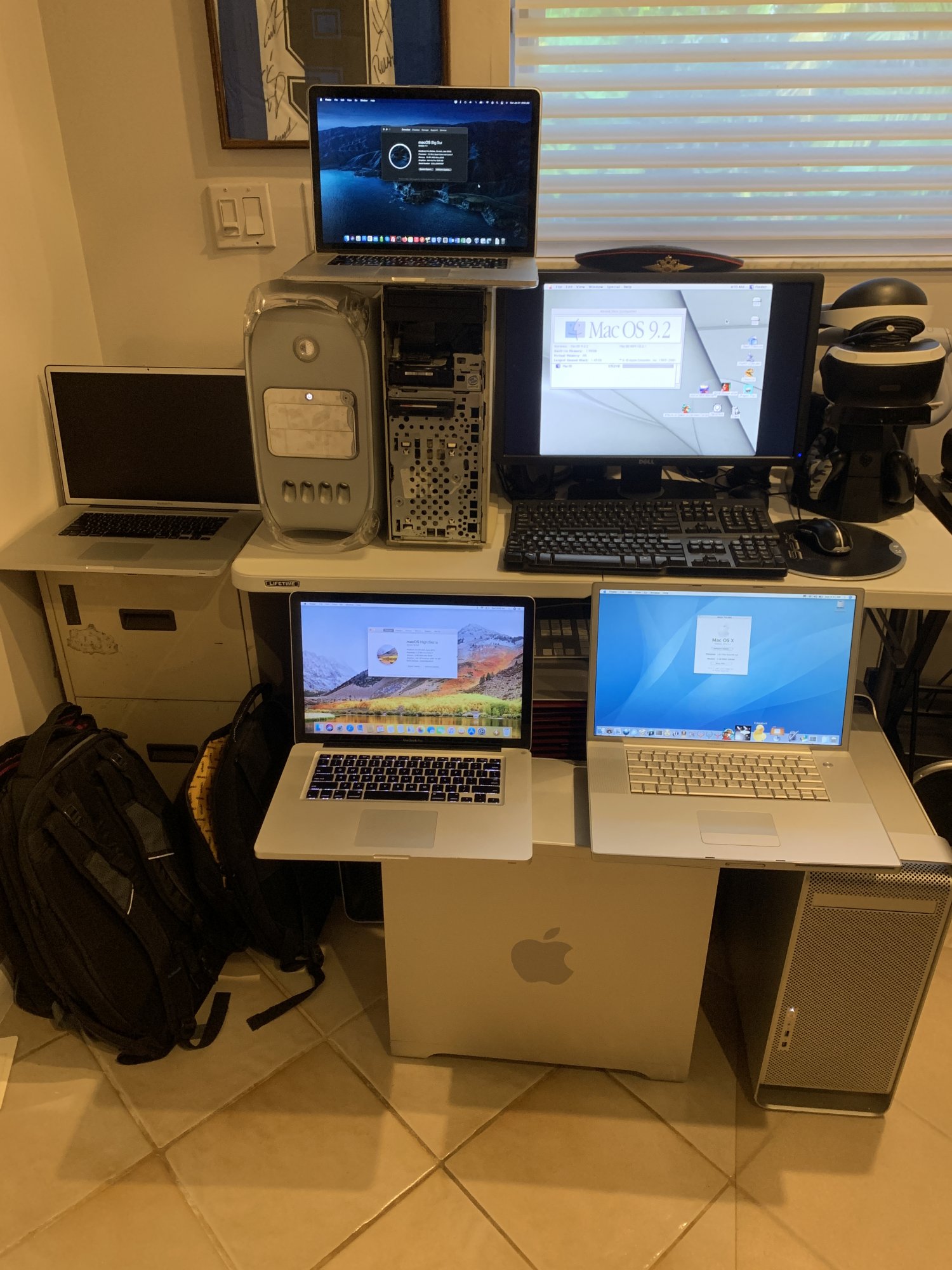 My Mac collection . I have a MDD DP1Ghz, a quad G5, a MacPro 2009 flash with 2010 firmware, 2 MacBook Pro 2011 (one with bad gpu so bypassing to intel gpu) and another with a bad smc chip (not sure how to fix it). A MacBookPro Retina 2013 and finally a PowerBook DLSD :) love the PPC community !