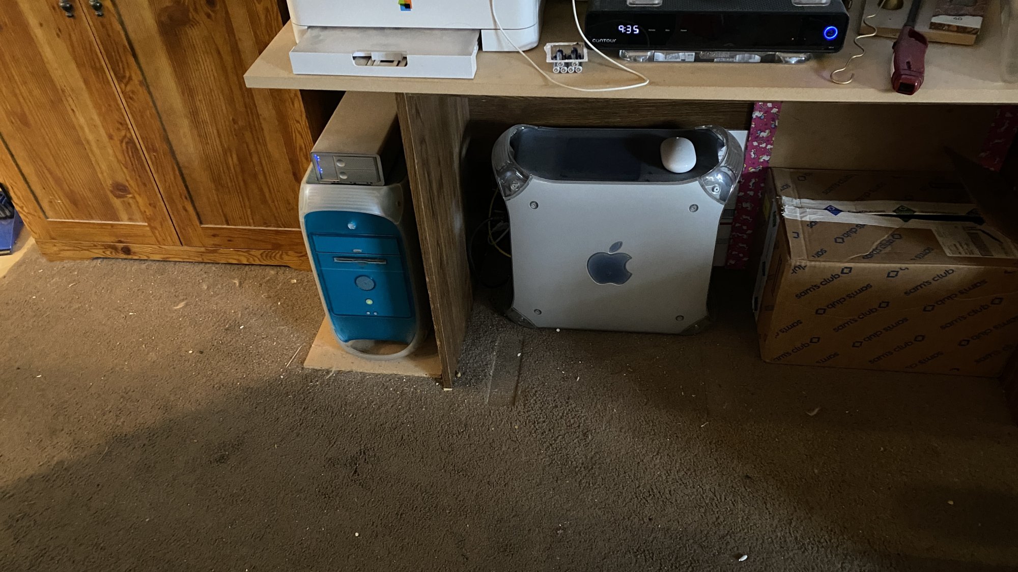 PowerMac G3/450 with 1GB ram and 2TB external RAID (via eSATA/PCI SATA card) & PowerMac G4/500 with PCI SATA card, 250GB boot drive and 2x 3TB SATA drives.