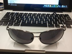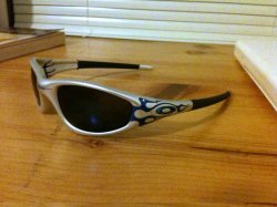 Some good ole Oakley's that have been used frequently for nearly ten years. Every once in a while I look for new sunglasses but all I ever seem to find are those godawful big glasses from the 80's. I'm not too big a fan of these plastic frame glasses either but they last forever since they never fall off.