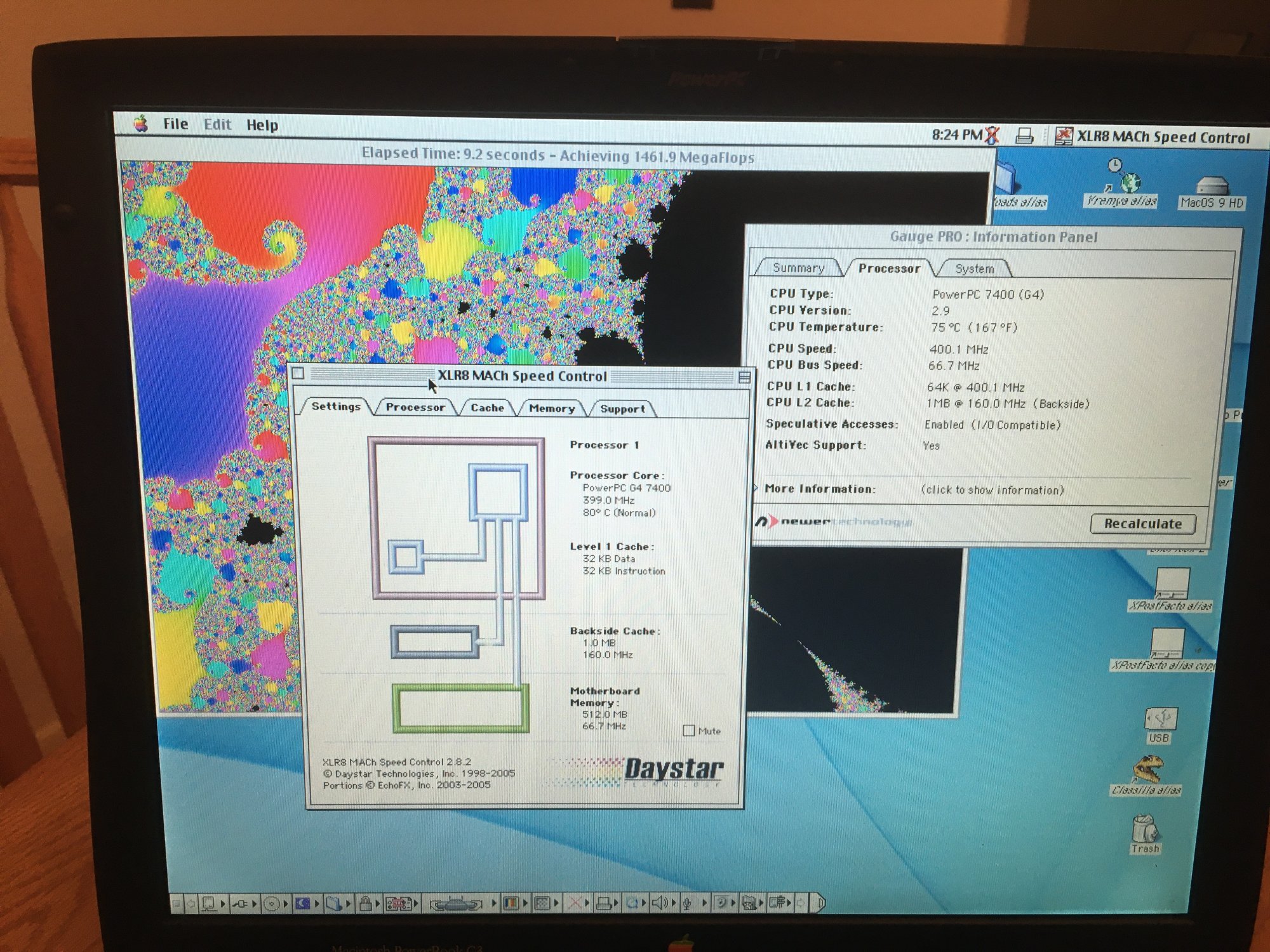 Fast-forward to this week- I purchased a "for parts only" 233mhz Wallstreet PDQ from eBay for $60. It arrived yesterday, and is in, what I would call, very good condition with just a few scratches here and there, and dirty, dirty dirty. As it was complete, I decided to give it a once-over to see if it could be fixed. I pulled the 2gb drive out of it and installed a 100gb drive that was once in my Mini G4 running OS 9.2.2, replaced the paltry 32mb with 256mb of RAM, and it booted right up. The keyboard wasn't fastened down, and playing with the clips, I discovered that someone had pulled them so far back that they became dislodged from their track. I opened it up, pulled off the top case, and was able to fix the right-side clip. On the left side, the top case is missing a very small piece of plastic; sort of an angular ramp; where the spring lifts up, allowing the clip to snap forwards, so I have to carefully and manually clip and unclip this side to avoid dislodging the clip again. Other than that, there were no other issues. The screen is the brightest screen I've ever seen on a WS or PDQ, and the battery holds a full charge. I have another fully-working battery from my 250mhz WS, and the PDQ reports 6:30 of battery time on full charge. Pretty cool. All in all, this is a great looking and performing machine. I have a spare 266mhz card that I'll be dropping into it, and am considering calling on the services of our friend