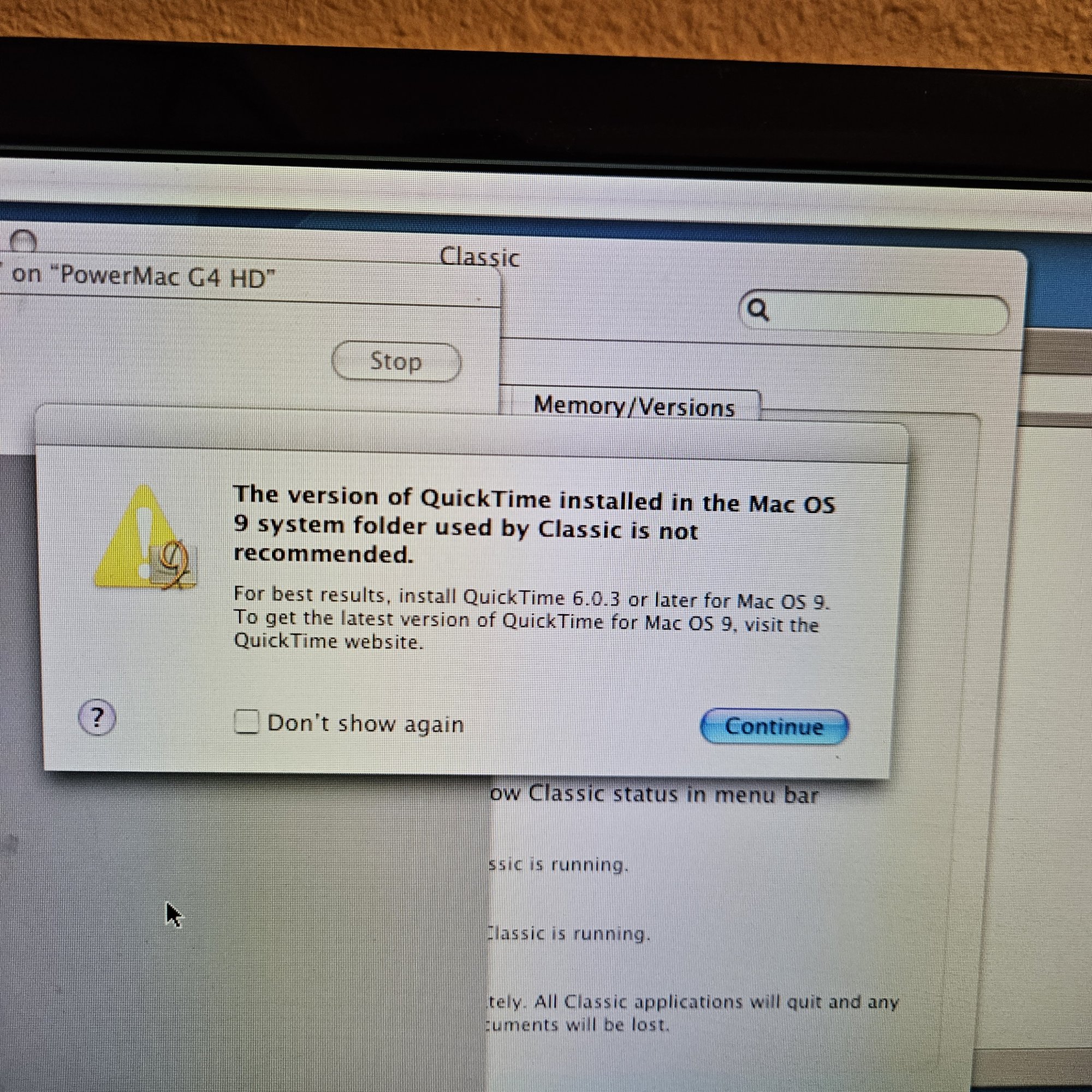 A warning pops up requesting that Classic have Quicktime 6.0.3 installed when I try and start ClassicYep.