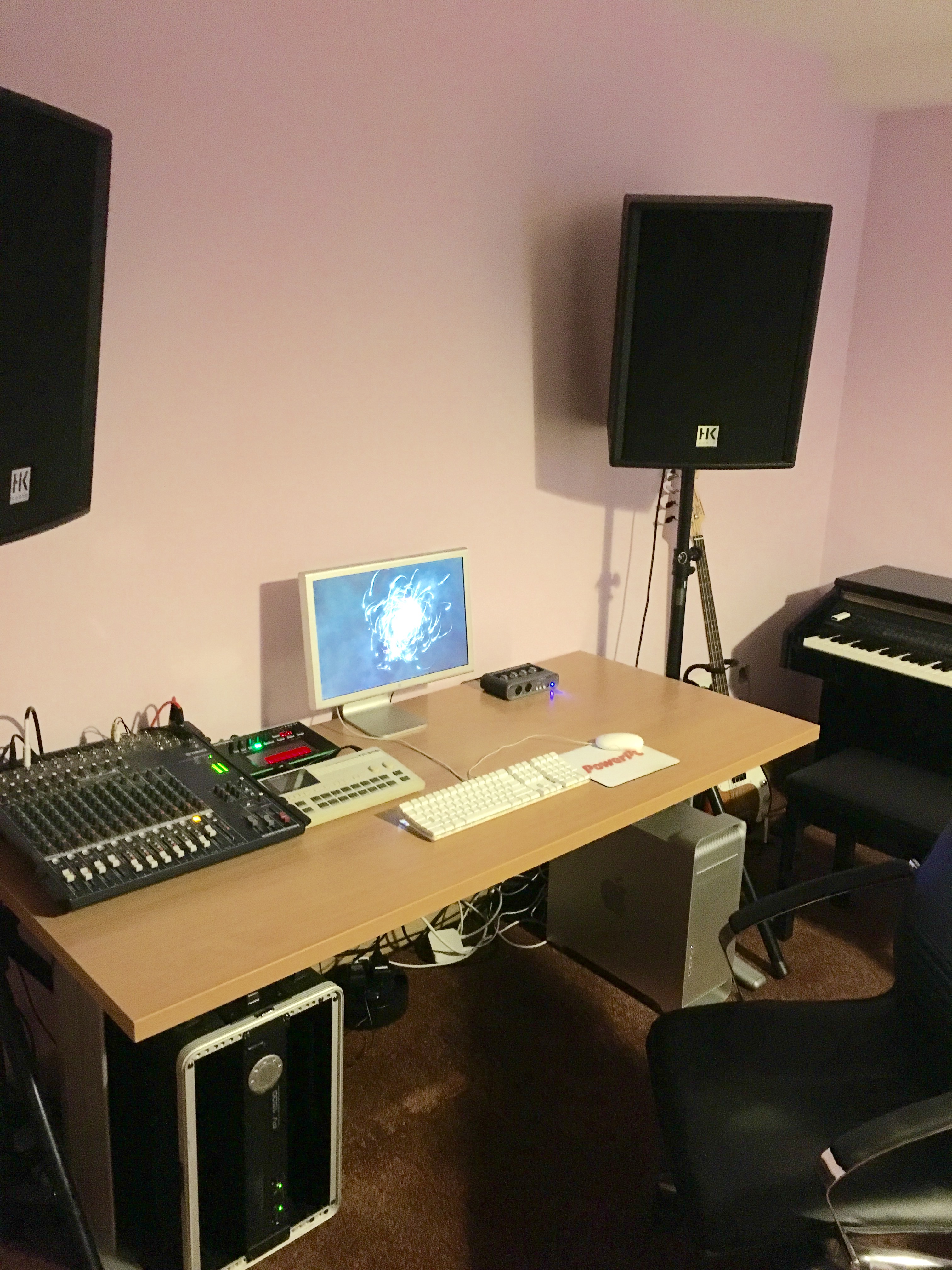 With my main gear still down in Dublin while I'm up the country for the summer, I've taken the time to set my G5 Quad up in a comfy and appealing manned. With a warm room, big solid desk and the luxury of using genuine PPC tech I have no exuses to stay away from the DAW over the next few months.