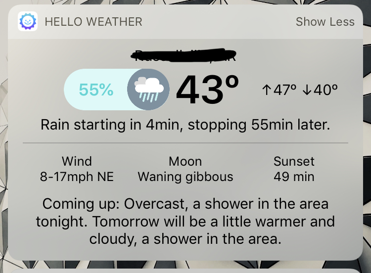 For years I used yahoo weather (still have it on my work phone), but it would often times be wrong. For the last year I've used Accuweather, but the app doesn't update in Notification Center, and it's hardly ever right with forecasts (ie no rain for 120 minutes when it's raining out now).