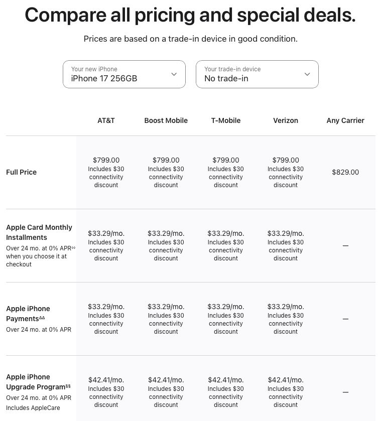 The Air and 17 Pro don't have the "connectivity discount", so they aren't affected. This situation only applies to the regular model, which requires you to have a postpaid account with the selected carrier.