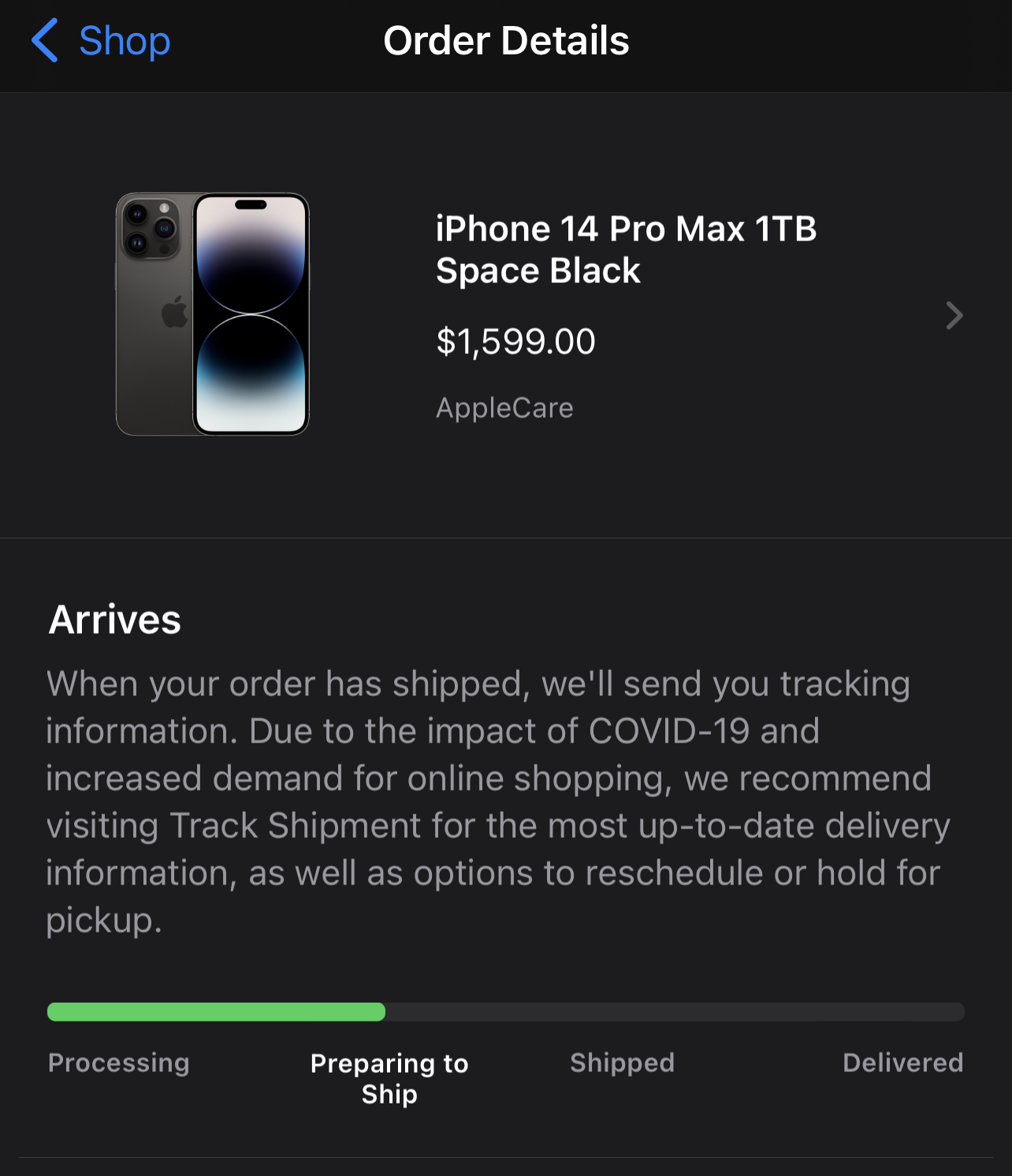 Mine is showing preparing to ship as well. I did my Pro max order at 6:02 am and my wife's through apple (tmobile) at around noon. Hers is still processing. Don't care because T-Mobile gave her double what apple offered for her Mini. I just went with the Apple trade in, amount was close enough. Save the upgrade on my line for another year.