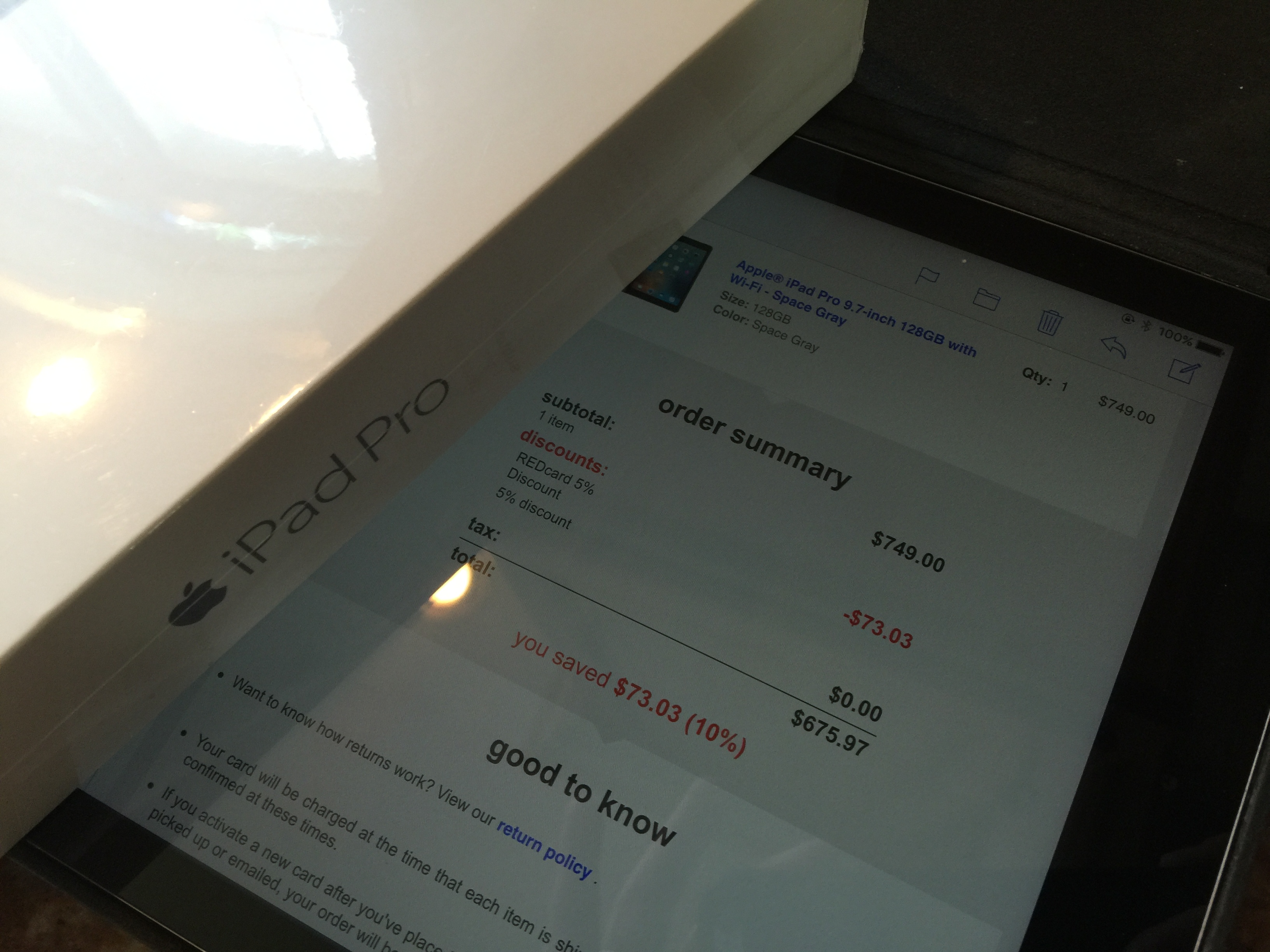 I just want to say thanks to the OP for starting this thread. I had already planned on getting mine from target using my redcard in a tax free state but this thread alerted me to the extra 5% off coupon. I saved $73 with no extra effort. (And this iPad Pro screen is amazing!) Thanks, OP!