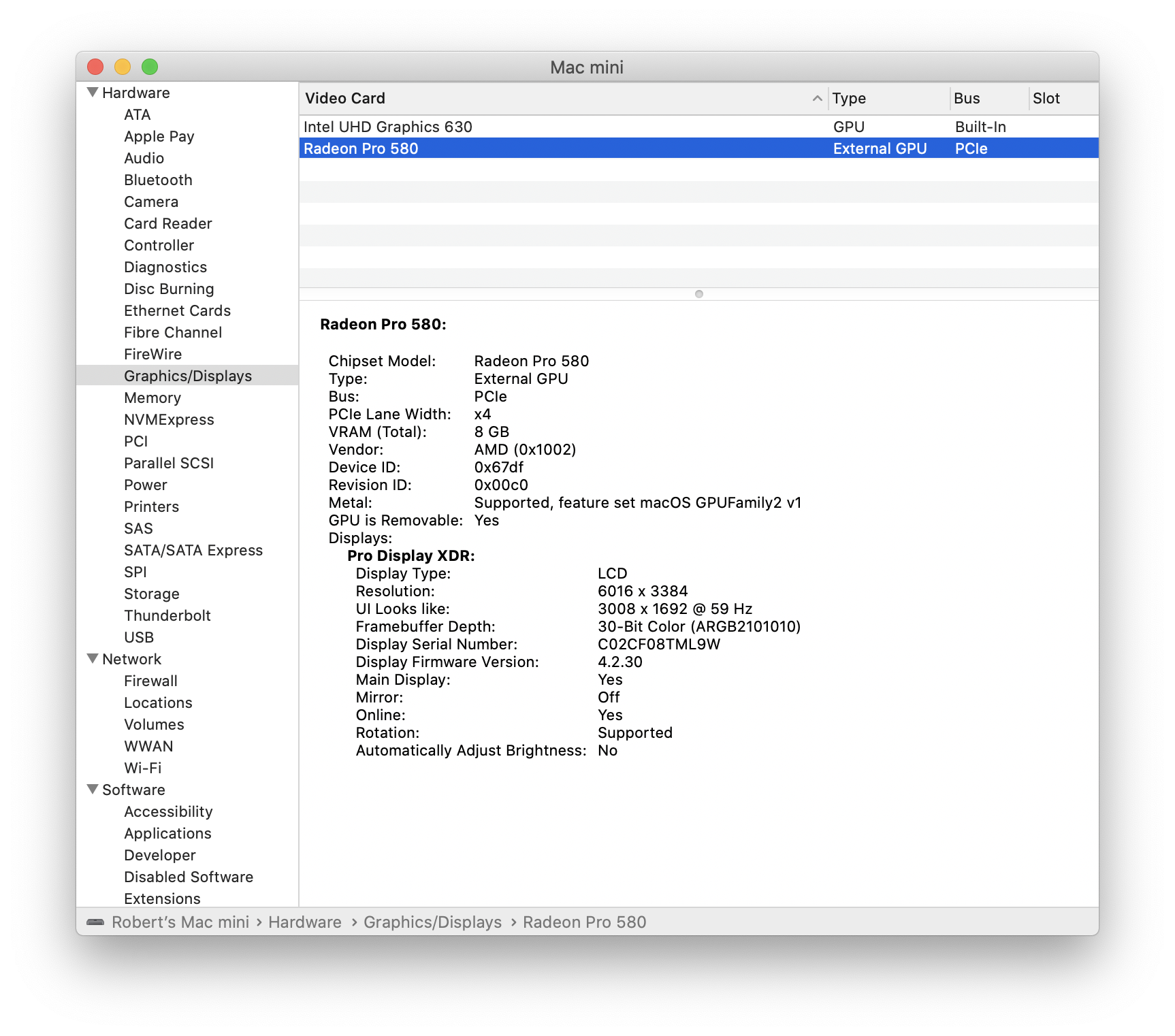 My setup is: 2018 mac mini -> rx580 blackmagic egpu -> pro. I haven't really tried to troubleshoot this at all, but I thought I'd reply just the same.